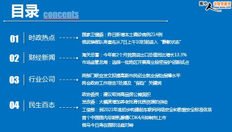 每日新闻速递 2022年3月8日 星期二 目录 时政热点 财经新闻 行业公司 民生百态 国家卫健委:昨日新增本土确诊病例214例 俄武装部队将宣布从7日上午10时起进入“静默状态” 海关总署:今年前2个月我国进出口总值同比增长13.3% 市场监管总局:选择一批地区开展商业秘密保护创新试点 两部门联合发文拟提高新市民创业就业保险保障水平 两会政府工作报告7处提及“保险”关键词 政协委员:建议取消商品房公摊面积 发改委:大幅度增加养老托育优质资源的供给 工信部:到2023年底初步构建起车联网网络安全和数据安全标准体系 首个中国国内早期乳腺癌CDK4/6抑制剂上市 俄乌今日将在国际法庭对峙 时政热点 国家卫健委:昨日新增本土确诊病例214例 2022-03-07 09:52 来源:环球网 3月6日0—24时,31个省(自治区、直辖市)和新疆生产建设兵团报告新增确诊病例327例。其中境外输入病例113例(广东51例,上海32例,四川11例,北京6例,河南5例,广西4例,天津1例,吉林1例,山东1例,重庆1例),含16例由无症状感染者转为确诊病例(四川9例,广东4例,河南3例);本土病例214例(广东69例,其中东莞市50例、深圳市19例;吉林54例,其中吉林市42例、长春市7例、延边朝鲜族自治州5例;山东46例,均在青岛市;甘肃12例,均在兰州新区;河北9例,均在邢台市;内蒙古7例,其中呼和浩特市3例、鄂尔多斯市2例、包头市1例、呼伦贝尔市1例;江苏5例,均在连云港市;云南4例,均在德宏傣族景颇族自治州;上海3例,其中徐汇区2例、浦东新区。1例;湖北2例,均在武汉市;山西1例,在太原市;浙江1例,在嘉兴市;广西1例,在防城港市),含3例由无症状感染者转为确诊病例(吉林2例,浙江1例)。无新增死亡病例。新增疑似病例4例,均为境外输入病例(均在上海) 俄武装部队将宣布从7日上午10时起进入“静默状态” 2022-03-07 09:52 来源:央视新闻 俄罗斯人道主义总部表示,俄罗斯武装部队将宣布从莫斯科当地时间7日上午10时起进入“静默状态”。同时,在乌克兰基辅、马里乌波尔、哈尔科夫和苏梅等地开启人道主义通道。 俄军方将使用无人机监控各地居民撤离情况,以防止乌方的破坏行动。