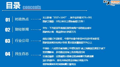 每日新闻速递 2022年3月16日 星期三 目录 时政热点 财经新闻 行业公司 民生百态 本土新增“3507+1647”,其中吉林省3076+991 国家卫健委:3月以来本土感染者超1万例! 华为:下月起至年底园区服务类商户场地租金减半 国家统计局:商品房均价跌破万元 保险主题LOF创新低,中国平安盘中跌至44元创4年来新低 国家医保局发布统计快报 基本医保覆盖面95%以上 中消协:六成受访者消费公平感知良好 线上消费信任度低于线下 收快递感染新冠病毒的概率大吗?专家:尽量不要把快递外包装带回家 交通运输部:全国道路水路客运班线客票可免费退票 油价跌超6%,俄乌冲突或致全球粮价再涨20% 俄罗斯莫斯科取消强制戴口罩规定 时政热点 本土新增“3507+1647”,其中吉林省3076+991 2022-03-15 09:52 来源:澎湃新闻 3月14日0—24时,31个省(自治区、直辖市)和新疆生产建设兵团报告新增确诊病例3602例。其中境外输入病例95例,含20例由无症状感染者转为确诊病例;本土病例3507例(吉林3076例),含73例由无症状感染者转为确诊病例。无新增死亡病例。新增疑似病例2例,均为境外输入病例(均在上海)。 31个省(自治区、直辖市)和新疆生产建设兵团报告新增无症状感染者1768例,其中境外输入121例,本土1647例。 国家卫健委:3月以来本土感染者超1万例! 2022-03-14 09:52 来源:每日经济新闻 据央视新闻报道,国家卫生健康委有关负责人今天(14日)介绍,目前本土疫情已波及全国27个省份,呈现出点多、面广、频率大的特点。 国家卫生健康委疾控局副局长一级巡视员雷正龙表示,今年3月1日到13日,已经报告了本土感染者一万多例。根据目前情况来看,吉林、广东、上海疫情还在发展中,部分地方上升的速度还很快。内蒙古疫情已经处于收尾阶段。专家综合研判,目前我们国家的疫情防控总体来说,“外防输入、内防反弹”总策略,“动态清零”总方针,应对奥密克戎疫情是完全有效的,但是由于奥密克戎隐匿性强、传播快的特点,需要我们在应对疫情的过程中,要采取更早、更快、更严、更实的措施。