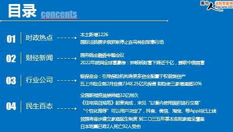 每日新闻速递 2022年3月18日 星期五 目录 时政热点 财经新闻 行业公司 民生百态 本土新增1226 国际法院要求俄罗斯停止在乌特别军事行动 国务院金融委专题会议 2022年胡润全球富豪榜:钟睒睒财富下降近千亿,蝉联中国首富 银保监会:引导保险机构将更多资金配置于权益类资产 五上市险企前2月合揽7348.25亿元保费 财险老三家增速超10% 全国新冠疫苗接种超32亿剂次 《住宅项目规范》起草完成,未见“以套内使用面积进行交易” “个性化推荐”可以用户决定了,抖音、微信、淘宝、微博、小红书等App均已上线 我国将逐步建立家庭医生制度 到二〇三五年基本实现家庭全覆盖 日本地震已致2人死亡92人受伤 时政热点 本土新增1226 2022-03-17 09:52 来源:澎湃新闻 3月16日0—24时,31个省(自治区、直辖市)和新疆生产建设兵团报告新增确诊病例1317例。其中境外输入病例91例,含19例由无症状感染者转为确诊病例;本土病例1226例,含28例由无症状感染者转为确诊病例。无新增死亡病例。新增疑似病例8例,均为境外输入病例(均在上海)。 国际法院要求俄罗斯停止在乌特别军事行动 2022-03-17 09:52 来源:中国新闻网 据国际文传电讯社报道,当地时间16日,联合国国际法院(ICJ)要求俄罗斯立即停止在2022年2月24日在乌克兰开始的军事行动。国际法院指出,“双方应避免任何加剧或延长冲突,以及阻碍解决冲突的行动。”此前,乌克兰向海牙国际法庭提起针对俄罗斯的诉讼。