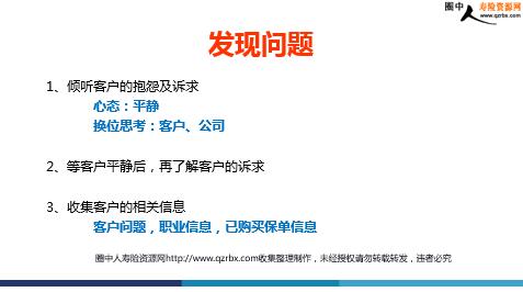 客户资源哪里来 客户资源哪里来? 作为新人,最易碰到的问题之一:客户资源枯竭 如何迅速的积累客户,并最终来提升自己的收入呢? 我的第一张单 一次理赔经历带来的收获 给我的启示 1、老客户本身有保险意识,省去观念沟通过程 2、帮助客户解决问题,迅速建立信任感 3、帮助客户处理问题,业务知识快速提升 4、帮助客户的过程中,顺利收集客户信息 5、维护好客户,挽回公司形象主动寻找 问题件 理赔件 业务办理件 寻找途径 公司下发的附加险通知 xx投诉中心 大厅柜面电话联系 能面谈的:想尽办法面谈,这样才能跟客户有更进一步的了解; 无法面谈的:电话沟通,沟通不畅的,找到面谈的机会;无论怎样,都要在客户心中留下好印象,让客户一旦有保险方面的问题,首先想到我。 发现问题 1、倾听客户的抱怨及诉求心态:平静换位思考:客户、公司 2、等客户平静后,再了解客户的诉求 3、收集客户的相关信息客户问题,职业信息,已购买保单信息解决问题 自己懂的——马上解决 自己不懂的——咨询相关部门(理赔、核保、柜面、领导) 无法解决的 ——耐心向客户说明无法解决的原因,让客户感受到自己确实尽力(针对每一个问题的解决方法进行逐一记录、整理) 交换联系方式 方便客户找我 进行客户的追踪针对客户需求做持续追踪,客户感到被重视。 多次邀约 针对客户的需求与兴趣进行邀约 约访或邀约3-6次/人,面见2-3次/人一次邀约不成功要制造下次邀约的机会,不轻易放弃。 我的收获 1、积累客户资源 2、约访或邀约成功率 3、最终签单率 4、还有转介绍100余人