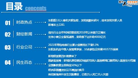 每日新闻速递 2022年3月23日 星期三 目录 时政热点 财经新闻 行业公司 民生百态 东航载132人客机失联坠毁,发现残骸和碎片,尚未发现失联人员 新增本土2281 信托行业去年利润总额实现2018年以来首次正增长 支持小微企业留抵退税,财政部下达补助4000亿元 2021年寿险电销行业累计保费同比下滑9.3% 东航坠机由中国人保首席承保,10余家险企排查MU5735保单 新冠疫苗第四针就要来了 国家医保局:新冠抗原检测试剂临时性纳入医保,辉瑞口服药纳入医保支付范围 全国影院营业率降至50%以下 欧洲多国爆发抗议不满油价飙升 突尼斯海岸外发生沉船事故,已致25人死亡35人失踪 时政热点 东航载132人客机失联坠毁,发现残骸和碎片,尚未发现失联人员 2022-03-22 09:52 来源:北京日报 21日14时38分许,东方航空公司MU5735航班执行昆明至广州任务时,在广西梧州市上空失联并坠毁。机上载有乘客123人、机组人员9人。目前,最先抵达的救援部队发现客机残骸和碎片,但目前尚未发现机上失联人员。 新增本土2281 2022-03-22 09:52 来源:澎湃新闻 3月21日0—24时,31个省(自治区、直辖市)和新疆生产建设兵团报告新增确诊病例2338例。其中境外输入病例57例,本土病例2281例。
