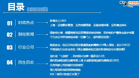 每日新闻速递 2022年4月1日 星期五 目录 时政热点 财经新闻 行业公司 民生百态 新增本土1803 上海:全域静态管理、全员核酸筛查、全面流调排查、全民清洁消杀 国家统计局:随着局部地区疫情得到有效控制,受抑制的产需将会逐步恢复,市场有望回暖 千亿央企华侨城将迎来新一任掌门人:保利原总经理! 银保监会:险企已向东航空难遇难者家属赔付14笔人身险,合计1485万 中国保险行业协会发布《商业健康保险目录的标准制定与长期发展》课题报告 聚焦三大重点研究方向 油价或“七连涨”,机构预计加满一箱多花4.5元 国内航线燃油附加费再度上调 长途航班燃油附加费涨至100元 北京两家公司因超时加班被罚 瑞士取消所有防疫限制措施 6米!埃菲尔铁塔又长高了 时政热点 新增本土1803 2022-03-31 10:01 来源:澎湃新闻 3月30日0—24时,31个省(自治区、直辖市)和新疆生产建设兵团报告新增确诊病例1839例。其中境外输入病例36例,本土病例1803例。 上海:全域静态管理、全员核酸筛查、全面流调排查、全民清洁消杀 2022-03-31 13:39 来源:光明网 上海市领导干部大会于30日晚举行,并以视频方式连线到全市所有街镇,对疫情防控工作进行再动员、再部署、再落实。 上海市委书记、市新冠肺炎疫情防控工作领导小组组长李强在会上指出,要坚定坚决实施好这一轮面上核酸筛查工作,采取全域静态管理、全员核酸筛查、全面流调排查、全民清洁消杀等综合防控措施,分批实施、无缝衔接,真正把风险人群管住,尽早实现社会面清零。