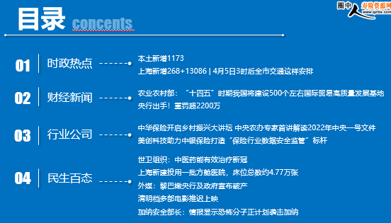 每日新闻速递 2022年4月6日 星期三 目录 时政热点 财经新闻 行业公司 民生百态 本土新增1173 上海新增268+13086 | 4月5日3时后全市交通这样安排 农业农村部:“十四五”时期我国将建设500个左右国际贸易高质量发展基地 央行出手!重罚超2200万 中华保险开启“乡村振兴大讲坛” 中央农办专家首讲解读2022年中央一号文件 美创科技助力中银保险打造“保险行业数据安全监管”标杆 世卫组织:中医药能有效治疗新冠 上海新建投用一批方舱医院,床位总数约4.77万张 外媒:黎巴嫩央行及政府宣布破产 清明档多部电影推迟上映 加纳安全部长:情报显示恐怖分子正计划袭击加纳 时政热点 本土新增1173 2022-04-05 11:25 来源:澎湃新闻 4月4日0—24时,31个省(自治区、直辖市)和新疆生产建设兵团报告新增确诊病例1235例。其中境外输入病例62例(四川34例,山东6例,广东6例,广西5例,上海3例,河南3例,北京2例,福建2例,天津1例),含21例由无症状感染者转为确诊病例(四川14例,河南3例,天津1例,福建1例,广东1例,广西1例);本土病例1173例 。 上海新增268+13086 | 4月5日3时后全市交通这样安排 2022-04-05 09:16 来源:澎湃新闻 上海市卫健委今早(5日)通报:2022年4月4日0—24时,新增本土新冠肺炎确诊病例268例和无症状感染者13086例。 4月4日,澎湃新闻记者从上海市交通委获悉,根据市疫情防控工作领导小组办公室最新发布的消息,现就4月5日3时后有关交通安排通告如下: 轨道交通、公交行业、巡游出租汽车和网约车、道路旅客运输、铁路客运、水上客运的交通组织和保障方案维持当前状态不变。机场线除新增机场环一线、机场守航夜宵线停运外,其它运行线路方案维持当前状态不变。