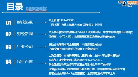 每日新闻速递 2022年4月7日 星期四 目录 时政热点 财经新闻 行业公司 民生百态 本土新增1383+19089 “四叶草”将建上海最大方舱 新增311+16766 华为去年在欧洲申请专利3544项!欧洲专利局:中国专利申请数十年增4倍 商务部:今年1~2月,我国服务贸易继续保持较好增长态势 保险业布局新市民金融服务:产品创新亟待加快 上海疫情下保险机构全力保障 业务稳定运行 上海卫健委:有特殊需要的儿童感染者,监护人可自愿申请陪护 文旅部:清明假期国内旅游出游7541.9万人次, 联合国报告称现在行动可使温室气体排放2030年前减半 欧盟委员会提议对俄实施第五轮制裁!德、法等国宣布驱逐俄外交官 奥密克戎变异株BA.2在美国蔓延,全美新冠发病率不断上升 时政热点 本土新增1383+19089 2022-04-06 09:59 来源:澎湃新闻 4月5日0—24时,31个省(自治区、直辖市)和新疆生产建设兵团报告新增确诊病例1415例。其中境外输入病例32例,含17例由无症状感染者转为确诊病例;本土病例1383例 。 31个省(自治区、直辖市)和新疆生产建设兵团报告新增无症状感染者19199例,其中境外输入110例,本土19089例。 “四叶草”将建上海最大方舱 新增311+16766 2022-04-06 09:59 来源:澎湃新闻上海正将国家会展中心(上海)改建成又一座方舱医院,建成后有望提供4万张床位,将成为上海目前规模最大的方舱医院。4月5日晚,承建方工人已经进入到国家会展中心,并开始进行地面铺装作业。 上海市卫健委今早(6日)通报:2022年4月5日0—24时,新增本土新冠肺炎确诊病例311例和无症状感染者16766例,其中40例确诊病例为此前无症状感染者转归,4例确诊病例和16256例无症状感染者在隔离管控中发现,其余在相关风险人群排查中发现。新增境外输入性新冠肺炎确诊病例4例和无症状感染者1例,均在闭环管控中发现。