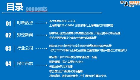 每日新闻速递 2022年4月8日 星期五 目录 时政热点 财经新闻 行业公司 民生百态 本土新增1284+21711 上海新增322+19660 苏浙紧急为上海筹措6万间隔离房 重磅!金融稳定制度顶层设计出炉! 年内全国已超65个城市出台楼市松绑政策 国常会决定对特困行业实行阶段性缓缴养老保险费政策 银保监会发布《关于2022年银行业保险业服务全面推进乡村振兴重点工作的通知》 教育部:到2024年实现中考省级统一命题 明起调整!买火车票有大变化 微信支持听文字消息 联合国发出气候变化红色警报 总统辞职、副总统被罢免,也门局势发生重大变化 时政热点 本土新增1284+21711 2022-04-07 09:59 来源:澎湃新闻 4月6日0—24时,31个省(自治区、直辖市)和新疆生产建设兵团报告新增确诊病例1323例。其中境外输入病例39例(福建15例,四川11例,上海7例,北京1例,辽宁1例,江西1例,湖南1例,广东1例,云南1例),含10例由无症状感染者转为确诊病例(四川9例,广东1例);本土病例1284例。 31个省(自治区、直辖市)和新疆生产建设兵团报告新增无症状感染者21784例,其中境外输入73例,本土21711例。 上海新增322+19660 苏浙紧急为上海筹措6万间隔离房 2022-04-07 09:59 来源:澎湃新闻 2022年4月6日0—24时,新增本土新冠肺炎确诊病例322例和无症状感染者19660例,其中15例确诊病例为此前无症状感染者转归,12例确诊病例和19027例无症状感染者在隔离管控中发现,其余在相关风险人群排查中发现。 4月6日,澎湃新闻记者从上海市疫情防控工作指挥部地区组获悉,根据国务院联防联控机制统一部署,4月初,江苏、浙江将紧急为上海抗击新冠疫情期间相关隔离人员提供房源,总量为6万间。其中,江苏、浙江各3万间。目前,江苏已筹措并提供1.6万间,分别位于无锡市2000间、扬州市3300间、常州市2200间、苏州市980间、镇江市960间、泰州市1000间、盐城市2300间、南京市3200间;浙江已筹措并提供2.1万间,分别位于杭州市5200间、宁波市6200间、台州市2000间、绍兴市3000间、金华市3000间、湖州市2000间。剩余房源将于近日筹措完成。