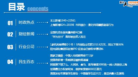每日新闻速递 2022年4月9日 星期六 目录 时政热点 财经新闻 行业公司 民生百态 本土新增1540+22561 上海新增824+20398 市网信办:查处网络圈群造谣行为 全国机动车保有量突破4亿辆 “华为支付”商标被自然人抢注 1家机构被停新2个月!3月保险业罚款1313.6万元,同比下降36% 阳光保险集团拟赴港IPO 证监会已接收申请材料 国家卫健委:中国人均预期寿命77.3岁 我国将新增一条能源运输铁路通道 阿里旗下饿了么、大润发、盒马、菜鸟增调3000名一线人员保供上海 世锦赛主办权被取消,俄罗斯索赔8000万美元 美国发布年度留学生报告:中国留学生近35万,是亚洲最大生源地 时政热点 本土新增1540+22561 2022-04-08 09:59 来源:澎湃新闻 4月7日0—24时,31个省(自治区、直辖市)和新疆生产建设兵团报告新增确诊病例1576例。其中境外输入病例36例,含10例由无症状感染者转为确诊病例;本土病例1540例。无新增死亡病例。新增疑似病例4例,均为境外输入病例(均在上海)。 31个省(自治区、直辖市)和新疆生产建设兵团报告新增无症状感染者22648例,其中境外输入87例,本土22561例。 上海新增824+20398 市网信办:查处网络圈群造谣行为 2022-04-08 09:59 来源:澎湃新闻 连日来上海市网信办接到许多市民反映,在社交媒体特别是微信圈群中,有人大肆制造、发布、传播有关上海新冠肺炎防控工作的谣言和不实信息,希望管理部门严肃处理。为此,上海市网信办4月8日发布公告表示:对恶意传播谣言的群组将依法作出处理,呼吁市民共同维护健康有序清朗的网络空间。 上海市卫健委今早(8日)通报:2022年4月7日0—24时,新增本土新冠肺炎确诊病例824例和无症状感染者20398例,其中323例确诊病例为此前无症状感染者转归,121例确诊病例和19798例无症状感染者在隔离管控中发现,其余在相关风险人群排查中发现。新增境外输入性新冠肺炎确诊病例4例和无症状感染者3例,均在闭环管控中发现。