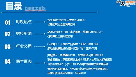 每日新闻速递 2022年4月15日 星期五 目录 时政热点 财经新闻 行业公司 民生百态 本土确诊2999例 无症状26318例 长春实现社会面清零目标 胡润研究院:中国“富裕家庭”数量已达508万户 各地最低工资标准公布 行业首个!人身险产品检核“天眼”即将上线 多地抛枝保险机构 落户奖励“卷”至5000万 数据显示:疫情暴发以来,全球烟民人数下降13% 联合国报告:新冠疫情使全球8.8亿多人去年陷入极端贫困 世界卫生组织:只打一针HPV疫苗也能有效预防宫颈癌 香港特区政府宣布:4月21日起逐步放宽社交距离措施 美国知名健美冠军去世,年仅44岁 时政热点 本土确诊2999例 无症状26318例 2022-04-14 09:59 来源:红星新闻 4月13日0—24时,31个省(自治区、直辖市)和新疆生产建设兵团报告新增确诊病例3020例。其中境外输入病例21例,含3例由无症状感染者转为确诊病例;本土病例2999例,含344例由无症状感染者转为确诊病例。无新增死亡病例。无新增疑似病例。 31个省(自治区、直辖市)和新疆生产建设兵团报告新增无症状感染者26391例,其中境外输入73例,本土26318例。 长春实现社会面清零目标 2022-04-14 09:59 来源:澎湃新闻 记者从今天(14日)上午长春市政府召开的本轮疫情防控工作新闻发布会上获悉,按照国家疫情防控有关规定,通过对最新一轮核酸检测结果综合研判,判定4月13日24时长春市实现了社会面清零目标。