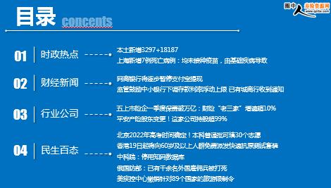 每日新闻速递 2022年4月20日 星期三 目录 时政热点 财经新闻 行业公司 民生百态 本土新增3297+18187 上海新增7例死亡病例:均未接种疫苗,由基础疾病导致 网商银行将逐步暂停支付宝提现 监管鼓励中小银行下调存款利率浮动上限 已有城商行收到通知 五上市险企一季度保费破万亿:财险“老三家”增速超10%,寿险保费仍承压 平安产险股东变更!这家公司持股超99% 北京2022年高考时间确定!本科普通批可填30个志愿 香港19日起将向60岁及以上人群免费派发快速抗原测试套装 中科院:停用知网数据库 俄国防部:已有千余名外国雇佣兵被打死 美疾控中心撤销针对89个国家的旅游限制令 时政热点 本土新增3297+18187 2022-04-19 08:59 来源:国家卫健委 4月18日0—24时,31个省(自治区、直辖市)和新疆生产建设兵团报告新增确诊病例3316例。其中境外输入病例19例,含5例由无症状感染者转为确诊病例;本土病例3297例,含1015例由无症状感染者转为确诊病例。新增死亡病例7例,均为本土病例,在上海;无新增疑似病例。 截至4月18日24时,据31个省(自治区、直辖市)和新疆生产建设兵团报告,现有确诊病例30384例(其中重症病例75例),累计治愈出院病例153319例,累计死亡病例4648例,累计报告确诊病例188351例,现有疑似病例5例。累计追踪到密切接触者2908653人,尚在医学观察的密切接触者418331人。 上海新增7例死亡病例:均未接种疫苗,由基础疾病导致 2022-04-19 09:59 来源:澎湃新闻 4月19日,上海市人民政府新闻办公室举行疫情防控工作新闻发布会。吴乾渝介绍,4月18日,上海市新增3084例新冠肺炎本土确诊病例,其中包含此前通报过的974例无症状感染者转归确诊病例;新增17332例本土无症状感染者。4月18日,新增死亡病例7例。年龄从60岁到101岁,合并冠心病、糖尿病、高血压、脑梗后遗症、脑出血等严重的基础疾病。他们均未接种新冠肺炎病毒疫苗。上述7例入院后病情加重,抢救无效死亡,直接的死亡原因由基础疾病导致。