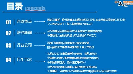每日新闻速递 2022年4月22日 星期五 目录 时政热点 财经新闻 行业公司 民生百态 国家卫健委:昨日新增本土确诊病例2830例 本土无症状感染者16552例 个人养老金来了!每人每年缴纳上限1.2万 华为终端全面进军商用市场 新老势力迎来交接时刻 中国核准六台核电机组 涉及总投资1200亿元 两部门鼓励银保机构推动公路交通发展 阳光保险正式递表冲刺国内第十家上市险企 东航MU5735事故调查初步报告,民航局回应 中国牵头的首个新冠病毒核酸检测国际标准发布 中科院科研证实:低体温延寿40%! 以色列将取消室内佩戴口罩的强制性防疫措施 七国集团:承诺自2022年起为乌克兰提供超240亿美元额外支持 时政热点 国家卫健委:昨日新增本土确诊病例2830例 本土无症状感染者16552例 2022-04-21 08:59 来源:新华网 国家卫健委通报:4月20日0—24时,31个省(自治区、直辖市)和新疆生产建设兵团报告新增确诊病例2841例。其中境外输入病例11例,含2例由无症状感染者转为确诊病例;本土病例2830例,含500例由无症状感染者转为确诊病例。新增死亡病例8例,均为本土病例,在上海;无新增疑似病例。 31个省(自治区、直辖市)和新疆生产建设兵团报告新增无症状感染者16617例,其中境外输入65例,本土16552例。 个人养老金来了!每人每年缴纳上限1.2万 2022-04-21 09:59 来源:澎湃新闻 4月21日,国务院办公厅发布《关于推动个人养老金发展的意见》。 据《意见》,在中国境内参加城镇职工基本养老保险或者城乡居民基本养老保险的劳动者,可以参加个人养老金制度。个人养老金实行个人账户制度,缴费完全由参加人个人承担,实行完全积累。参加人通过个人养老金信息管理服务平台(以下简称信息平台),建立个人养老金账户。个人养老金账户是参加个人养老金制度、享受税收优惠政策的基础。 《意见》显示,参加人每年缴纳个人养老金的上限为12000元。人力资源社会保障部、财政部根据经济社会发展水平和多层次、多支柱养老保险体系发展情况等因素适时调整缴费上限。