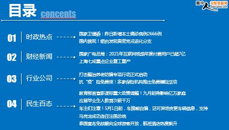 每日新闻速递 2022年4月26日 星期二 目录 时政热点 财经新闻 行业公司 民生百态 国家卫健委:昨日新增本土确诊病例2666例 国内首现!烟台发现奥密克戎进化分支 国家广电总局:2021年互联网视频年度付费用户已超7亿 上海七成重点企业复工复产 打击整治养老防骗专项行动正式启动 抗“疫”险免费领!多家保险机构推出免费赠险活动 教育部官宣新课标重大政策调整!九月起将影响亿万家庭 应届毕业生人数首次破千万 车主们注意!5月1日起,车牌能自编,还可异地变更车辆信息,支持 马克龙成功连任法国总统 泰国宣布免核酸向全球游客开放,航班酒店热度飙升 时政热点 国家卫健委:昨日新增本土确诊病例2666例 2022年04月25日 09:06 来源:央视网 4月24日0—24时,31个省(自治区、直辖市)和新疆生产建设兵团报告新增确诊病例2680例。其中境外输入病例14例,含3例由无症状感染者转为确诊病例;本土病例2666例,含899例由无症状感染者转为确诊病例。新增死亡病例51例,均为本土病例,在上海;无新增疑似病例。新增无症状感染者17581例,其中境外输入53例,本土17528例。 国内首现!烟台发现奥密克戎进化分支 2022-04-25 12:39 来源:澎湃新闻 4月25日,山东烟台市召开疫情防控新闻发布会,介绍疫情防控最新情况。 记者从发布会上获悉, 烟台市共排查密接1700人、次密接3179人,全部落实隔离管控措施。第一时间开展病毒全基因组测序,截至目前已完成4个区市共16例本土病例基因测序分析,为同一条传播链,病例基因分型为奥密克戎BA.2.3进化分支,目前国内尚未发现。烟台市本起疫情为奥密克戎BA.2变异株感染引起,其传染性更强、潜伏期更短。