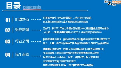 每日新闻速递 2022年4月28日 星期四 目录 时政热点 财经新闻 行业公司 民生百态 巴基斯坦发生自杀式炸弹袭击,3名中国公民遇难 日本疑似出现首例儿童不明原因急性肝炎病例 三部门:到2022年底力争国家区域医疗中心建设覆盖全国所有省份 人社部:一季度城镇新增就业285万人 完成全年目标的26% 积极推进商业银行、保险机构等优质金融机构依法设立基金管理公司 老人、儿童、新市民保障再扩容 银保监会通报人身险产品供给情况 德国最新临床研究:辉瑞mRNA疫苗可能引发自身免疫性肝炎 交通运输部:服务区和收费站关停关闭要提前向社会发布 男孩16楼坠下大难不死,医生:砸在轿车上起了缓冲作用 全球军费开支首次突破2万亿美元 加氢5分钟能跑600公里,现代首款氢汽车获得牌照 时政热点 巴基斯坦发生自杀式炸弹袭击,3名中国公民遇难 2022年04月27日 09:06 来源:凤凰卫视 巴基斯坦的卡拉奇大学26日发生一起自杀式炸弹袭击,袭击导致4人死亡,其中包括3名中国公民。爆炸发生后,卡拉奇军警迅速赶往现场,并进行了封锁。根据卡拉奇警方公布的初步调查报告,4名遇难者中,除了当地1名司机以外,其他3名均为卡拉奇大学孔子学院工作人员。 27日,中国驻巴使馆发布了紧急提醒,敦促在巴中国公民严密防范安全风险,避免前往人员聚集场所,非必要不外出。中国外交部和中国驻巴使领馆将继续敦促巴基斯坦相关部门做好善后和受伤人员救治工作,坚决打击涉案恐怖组织。中国人的血不能白流,此次事件的幕后黑手必将付出代价。 日本疑似出现首例儿童不明原因急性肝炎病例 2022-04-26 12:39 来源:海峡都市报 据央视新闻消息,近期,英国等地相继发生不明原因的儿童急性肝炎,日本厚生劳动省25日发表消息称,日本国内也出现了首例可能患有这种急性肝炎的儿童。医疗机构于本月21日通过地方政府,向厚生省报告了该病例。厚生省没有披露患者的症状、居住地、性别或年龄,是否存在基础疾病也不得而知。但可以确认的是患者没有进行过肝脏移植,其新冠病毒检测也呈阴性。 此前,据外媒报道,世卫组织当地时间23日称,随着不明来源的急性肝炎病例在儿童群体间增加,目前已有1名儿童被报告死亡。据统计,累计有12个国家至少报告了169例儿童病例,其中114例发生在英国。