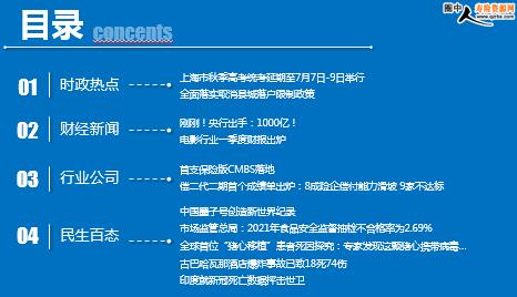 每日新闻速递 2022年5月8日 星期天 目录 时政热点 财经新闻 行业公司 民生百态 上海市秋季高考统考延期至7月7日-9日举行 全面落实取消县城落户限制政策 刚刚!央行出手:1000亿! 电影行业一季度财报出炉 首支保险版CMBS落地 偿二代二期首个成绩单出炉:8成险企偿付能力滑坡 9家不达标 中国墨子号创造新世界纪录 市场监管总局:2021年食品安全监督抽检不合格率为2.69% 最新官宣!全球首位“猪心移植”患者死因探究:专家发现这颗猪心携带病毒… 古巴哈瓦那酒店爆炸事故已致18死74伤 印度就新冠死亡数据抨击世卫 时政热点 上海市秋季高考统考延期至7月7日-9日举行 2022-05-07 12:22 来源:界面新闻 2022年5月7日,上海举行本市疫情防控工作新闻发布会,会议表示,针对考生和家长们高度关注的今年本市高考中考安排,我们在听取有关部门、有关专家、中学校长、高三初三年级的师生代表和学生家长代表等各方意见的基础上,根据当前疫情防控形势,经慎重研究并报教育部同意,作如下调整:上海市秋季高考统考延期至7月7日-9日举行,高中学业水平等级性考试延期至6月18日-19日举行;中考延期至7月11日-12日举行,取消初中理化实验考试、外语听说测试,相关考试成绩以满分计入学生中考总成绩。 全面落实取消县城落户限制政策 2022-05-07 07:20 来源:齐鲁壹点 近日,中办、国办印发《关于推进以县城为重要载体的城镇化建设的意见》。关于县城发展,有这些重要新要求。全面落实取消县城落户限制政策;加快发展大城市周边县城;保障县城建设正常用地需求等。此外,要按照国家统一部署,稳妥有序推进农村集体经营性建设用地入市。