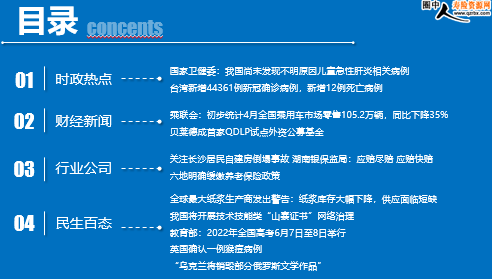 每日新闻速递 2022年5月9日 星期一 目录 时政热点 财经新闻 行业公司 民生百态 国家卫健委:我国尚未发现不明原因儿童急性肝炎相关病例 正在密切关注和持续监测相关情况 台湾新增44361例新冠确诊病例,新增12例死亡病例 乘联会:初步统计4月全国乘用车市场零售105.2万辆,同比下降35% 贝莱德成首家QDLP试点外资公募基金 关注长沙居民自建房倒塌事故 湖南银保监局:应赔尽赔 应赔快赔 六地明确缓缴养老保险政策 全球最大纸浆生产商发出警告:纸浆库存大幅下降,供应面临短缺 我国将开展技术技能类“山寨证书”网络治理 教育部:2022年全国高考6月7日至8日举行 英国确认一例猴痘病例 “乌克兰将销毁部分俄罗斯文学作品” 时政热点 国家卫健委:我国尚未发现不明原因儿童急性肝炎相关病例 正在密切关注和持续监测相关情况 2022-05-08 07:05 来源: 中国青年报 据健康中国公众号消息,5月7日,国家卫健委发布关于不明原因儿童急性肝炎有关问题解答。国家卫健委表示,目前,我国尚未发现相关病例,各级卫生健康行政部门和医疗机构正在密切关注和持续监测相关情况。这种急性肝炎患儿的共性特征是:①年龄1月-16岁,大多在10岁以下;②出现黄疸、恶心、腹痛、乏力、嗜睡和胃肠道症状(包括腹泻和呕吐),大多数患儿无发热;③实验室肝生化检查转氨酶(AST或ALT)明显升高。若孩子出现上述表现,家长应提高警惕,及时到医院就诊,建议查肝生化指标,并做血、尿液、粪便和呼吸道样本等相关病原学检测,以进一步确定孩子是否有急性肝炎及可能的病因。世界卫生组织近期调查显示,由于绝大部分不明原因急性肝炎患儿未接种新冠病毒疫苗,目前不支持和接种新冠病毒疫苗相关的假设。 台湾新增44361例新冠确诊病例,新增12例死亡病例 2022-05-08 14:15 来源:环球网 台湾联合新闻网刚刚消息称,台湾流行疫情指挥中心今天(8日)公布,台湾新增44361例新冠确诊病例,分别为44294例本土病例及67例境外输入病例。另外,确诊病例中新增12例死亡病例。报道称,台湾连续2天确诊病例破4万例。