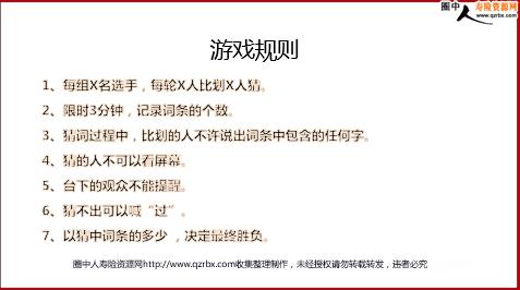 早会流程模板 大收展文化 专业活力创造 团队文化 勤奋 和谐 激情 两个坚持 坚持每天给老客户汇报工作 坚持每天常态增员 开心一刻 你来比划我来猜 游戏规则 1、每组X名选手,每轮X人比划X人猜。 2、限时3分钟,记录词条的个数。 3、猜词过程中,比划的人不许说出词条中包含的任何字。 4、猜的人不可以看屏幕。 5、台下的观众不能提醒。 6、猜不出可以喊“过”。 7、以猜中词条的多少,决定最终胜负。 喜讯播报精英分享 小早管练 工作安排