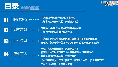 每日新闻速递 2022年6月1日 星期三 目录 时政热点 财经新闻 行业公司 民生百态 国务院印发稳经济六方面33项措施 今年全国高考报名人数,再创历史新高 国务院:继续推动实际贷款利率稳中有降 小米汽车公布全新自动驾驶专利 国务院:优化失业保险稳岗返还政策 进一步提高返还比例 理想汽车获保险中介牌照 众多新能源车企布局保险中介业务 未成年人犯罪记录封存,实施办法来了 我国科学家研制出可用于人体健康监测的“智能服装” 俄最大银行被曝将被除出SWIFT系统 全球超算新排名:美国“百亿亿次计算机”夺第一 日本富岳居第二 突发!《蒙娜丽莎》被抹了蛋糕 时政热点 国务院印发稳经济六方面33项措施 2022-05-31 13:41 来源:中国政府网 据中国政府网消息,5月31日,国务院发布关于印发扎实稳住经济一揽子政策措施的通知。按照《扎实稳住经济的一揽子政策措施》提出的六个方面33项具体政策措施及分工安排,对本部门本领域本行业的工作进行再部署再推动再落实,需要出台配套实施细则的,应于5月底前全部完成。近期,国务院办公厅将会同有关方面对相关省份稳增长稳市场主体保就业情况开展专项督查。 今年全国高考报名人数,再创历史新高 2022-05-31 13:41 来源:澎湃新闻 2022年高考全国统考除上海延期外,即将于6月7日、6月8日举行。今年全国高考报名1193万人,再创历史新高。