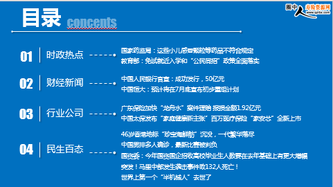 每日新闻速递 2022年6月21日 星期二 目录 01时政热点 国家药监局:这些小儿感冒颗粒等药品不符合规定 教育部:免试就近入学和“公民同招”政策全面落实 02财经新闻 中国人民银行官宣:成功发行,50亿元 中国恒大:预计将在7月底宣布初步重组计划 03行业公司 04民生百态 广东保险加快“龙舟水”案件理赔 报损金额1.92亿元 中国太保发布“家庭健康新主张”百万医疗保险“家安芯”全新上市 46岁香港地标“珍宝海鲜舫”沉没,一代繁华落尽 中国男排多人确诊,最新比赛被判负 国资委:今年国资国企招收高校毕业生人数要在去年基础上有更大增幅 突发!马里中部发生袭击事件致132人死亡! 世界上第一个“半机械人”去世了 时政热点 据国家药监局官网,经福建省食品药品质量检验研究院等8家药品检验机构检验,标示为广西金嗓子药业股份有限公司等9家企业生产的小儿感冒颗粒等10批次药品不符合规定。 2022-06-20 18:49 来源:澎湃新闻 国家药监局:这些小儿感冒颗粒等药品不符合规定