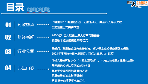 每日新闻速递 2022年7月4日 星期一 目录 时政热点 财经新闻 行业公司 民生百态 “福景001”轮遇险沉没,已救起3人,其余27人落水失联 某实验室正式揭牌成立! 2400亿!三大航史上最大订单花落空客 我国数字经济规模超45万亿元 三部门:鼓励险企优先支持物流、餐饮等企业投保疫情防控保险 2021年度寿险公司产品观察:百亿大单品共有33款 NASA局长声称小心“中国占领月球”,中方此前批美才是最大威胁 美国纽约控枪法案正式成为法律 富家千金成泰国总理最热人选 欧盟禁售燃油车时间确定! 第33届金曲奖获奖名单公布 时政热点 “福景001”轮遇险沉没,已救起3人,其余27人落水失联 2022-07-2 12:22 来源:央视新闻 广东省海上搜救中心最新发布,7月2日凌晨3时50分,阳江市海上救援中心在广东海事监管指挥系统值守中发现,海上风电场项目施工浮吊船“福景001”轮在广东阳江附近海域防台锚地避3号台风“暹芭”时,锚链断裂、走锚遇险。 2日12时许,“福景001”轮上3人被香港特区政府飞行队救助直升机救起,其余27人落水失联。目前,“福景001”轮已沉没,搜救行动正在紧张进行中。 某实验室正式揭牌成立! 2022-07-02 10:15 来源:澎湃新闻 “中国航天科工”微信公号7月1日消息,当天上午,某实验室在北京正式揭牌成立,进入试运行阶段。