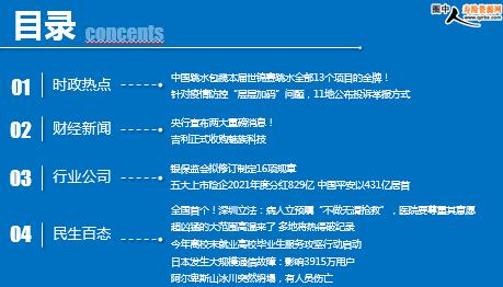 每日新闻速递 2022年7月5日 星期二 目录 时政热点 财经新闻 行业公司 民生百态 中国跳水包揽本届世锦赛跳水全部13个项目的金牌! 针对疫情防控“层层加码”问题,11地公布投诉举报方式 央行宣布两大重磅消息! 吉利正式收购魅族科技 银保监会拟修订制定16项规章 五大上市险企2021年度分红829亿 中国平安以431亿居首 全国首个!深圳立法:病人立预嘱“不做无谓抢救”,医院要尊重其意愿 超凶猛的大范围高温来了 多地将热得破纪录 今年离校未就业高校毕业生服务攻坚行动启动 日本发生大规模通信故障:影响3915万用户 阿尔卑斯山冰川突然坍塌,有人员伤亡 时政热点 中国跳水包揽本届世锦赛跳水全部13个项目的金牌! 2022-07-04 07:09 来源:澎湃新闻 7月4日凌晨,2022国际泳联世锦赛跳水比赛结束了全部13个项目的比拼。 在男子十米台决赛中,中国队选手杨健以515.55的总分成功卫冕,队友杨昊摘得铜牌。 至此,中国跳水梦之队斩获了本届世锦赛跳水全部13个项目的金牌! 针对疫情防控“层层加码”问题,11地公布投诉举报方式 2022-07-04 12:18 来源:人民日报 针对违反“九不准”现象,国务院联防联控机制综合组6月28日在国家卫健委官网首页开通了公众留言板。同时,在当日举行的国务院联防联控机制新闻发布会上,国家卫健委监督局副局长程有全表示,要求各省份成立专班整治“层层加码”问题。据健康时报不完全梳理,截至7月3日20时,11省(市、区)公布关于本地疫情防控“层层加码”问题的投诉举报方式。