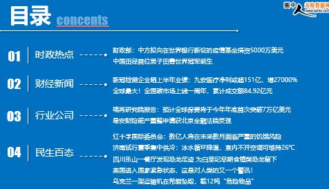 每日新闻速递 2022年7月18日 星期一 目录 时政热点 财经新闻 行业公司 民生百态 财政部:中方拟向在世界银行新设的疫情基金捐资5000万美元 中国田径首位男子田赛世界冠军诞生 新冠检测企业晒上半年业绩:九安医疗净利或超151亿,增27000% 全球最大!全国碳市场上线一周年,累计成交额84.92亿元 瑞再研究院报告:预计全球保费将于今年年底首次突破7万亿美元 易安财险破产重整申请获北京金融法院受理 红十字国际委员会:数亿人将在未来数月面临严重的饥饿风险 济南试行夏季集中供冷:冰水循环降温,室内不开空调可维持26℃ 四川乐山一餐厅发现恐龙足迹 为白垩纪早期食植类恐龙留下 英国进入国家紧急状态,这是对人类的又一个警讯! 乌克兰一架运输机在希腊坠毁,载12吨“危险物品” 时政热点 财政部:中方拟向在世界银行新设的疫情基金捐资5000万美元 2022-07-17 12:22 来源:新京报 据财政部网站消息,2022年7月15-16日,二十国集团(G20)主席国印度尼西亚在巴厘岛以线上线下相结合的方式主持召开G20财长和央行行长会议。会议主要就全球经济、全球卫生议程、国际金融架构、可持续金融、基础设施、国际税收和金融部门等议题进行了讨论。会后发布主席声明。财政部部长刘昆以视频方式出席会议并发言。 刘昆表示,G20各方应继续维护G20国际经济合作主要论坛定位,统筹疫情防控和经济社会发展,维护全球产业链供应链安全稳定,防止一些国家政策调整产生严重负面外溢效应。坚持构建全球发展伙伴关系,全面推进减贫、维护粮食和能源安全、守护人类健康等领域合作。为积极推进落实习近平主席提出的全球发展倡议,中方宣布拟向在世界银行新设的疫情大流行防范、准备和应对基金捐资5000万美元。 中国田径首位男子田赛世界冠军诞生 2022-07-17 10:15 来源:澎湃新闻 田径世锦赛的赛场永远不缺少奇迹。这一次,创造奇迹的是中国选手王嘉男。 7月17日,在第十八届世界田径锦标赛的男子跳远决赛中,中国名将王嘉男在自己的最后一跳中跳出8米36的成绩,超越了所有对手,为中国田径队赢下了本届世锦赛的首枚金牌,他也成为了中国田径首位男子田赛世界冠军。