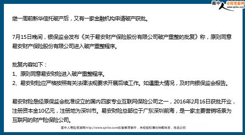 又一保险公司宣布破产!我的保单它还安全吗? 继一周前新华信托破产后,又有一家金融机构申请破产获批。 7月15日晚间,银保监会发布《关于易安财产保险股份有限公司破产重整的批复》称,原则同意易安财产保险股份有限公司进入破产重整程序。 批复内容如下: 1、原则同意易安财险进入破产重整程序。 2、易安财险应严格按照有关法律法规要求开展后续工作。如遇重大情况,及时向银保监会报告。 易安财险是经原保监会批准设立的国内四家专业互联网保险公司之一,2016年2月16日获批开业,注册资本金10亿元,注册地为深圳市。易安财险总部位于广东深圳前海,是一家主要营销场景为互联网的财产险保险公司。 截止此刻,公司资产为3.35亿,负债4.62亿,已出现资不抵债现象。早在2020年,该公司被银保监接管,直到7月15日正式宣布破产重组。 2020年7月17日,银保监会发布公告称,将对其实施接管,接管期限为一年。如接管工作未达到预期效果,接管期限依法延长。 2021年7月16日,银保监会决定延长接管期限一年,自2021年7月17日起至2022年7月16日止。没想到是银保监接管两年后,两家金融公司相继申请破产,让人唏嘘不已。 尽管可能很多人并没有投保它家的产品,但估计心里有很多疑问了:自己买的那家保险公司,会不会也会破产?是不是买保险还是要买大公司的,小公司不靠谱?最后是不是“打水漂”了? 今天我们就来聊一聊保险公司相关的那些事! 金融稳定关系到一个国家的经济发展,因此每个国家对金融的监管都非常严格。在我国来说有两个金融行业的监管机构证监会和银保监会,证监会主要负责监管证券行业市场,而银保监会负责监管银行业和保险业。 无论是银行还是保险行业,都直接关系到老百姓的资金,所以监管都会非常严格,基本不会出问题。 《保险法》第90条规定:经国务院保险监督管理机构同意,保险公司或者其债权人可以依法向人民法院申请重整、和解或者破产清算;国务院保险监督管理机构也可以依法向人民法院申请对该保险公司进行重整或者破产清算。