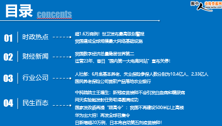 每日新闻速递 2022年7月25日 星期一 目录 时政热点 财经新闻 行业公司 民生百态 超1.6万病例!世卫发布最高级别警报 我国建成全球规模最大网络基础设施 我国数字经济总量稳居世界第二 运营23年,昔日“国内第一大电商网站”宣布关停! 人社部:6月底基本养老、失业保险参保人数分别为10.4亿人、2.33亿人 国民养老保险公司首款产品落地农业银行 中科院院士王福生:新冠疫苗接种不会引发白血病和糖尿病 问天实验舱发射任务取得圆满成功 国家发改委再提“限高令”:我国不再建设500米以上高楼 华为出大招!再发全球召集令 日新增超20万例,日本将启动第五剂疫苗接种! 时政热点 超1.6万病例!世卫发布最高级别警报 2022-07-24 12:22 来源:澎湃新闻 当地时间23日下午15点,世界卫生组织在日内瓦召开记者会,总干事谭德塞宣布,将猴痘疫情列为“国际关注突发公共卫生事件”。 近一个月来,越来越多的国家和地区向世卫组织报告了更多的猴痘病例。截至目前,已有75个国家和地区向世卫组织报告了超过1.6万例猴痘病例。7月21日,世卫组织再次召开关于猴痘疫情的突发事件委员会会议,但突发事件委员会未能就猴痘疫情是否构成“国际关注的突发公共卫生事件”达成一致。 我国建成全球规模最大网络基础设施 2022-07-24 10:15 来源:人民网 目前,我国已建成全球规模最大、技术领先的网络基础设施。截至2021年底,我国建成142.5万个5G基站,总量占全球60%以上,行政村、脱贫村通宽带率达100%;IPv6地址资源总量位居世界第一;算力规模全球排名第二。 数据资源价值加快释放。2017年到2021年,我国数据产量从2.3ZB增长至6.6ZB,全球占比9.9%,位居世界第二。大数据产业规模快速增长,从2017年的4700亿元增长至2021年的1.3万亿元。