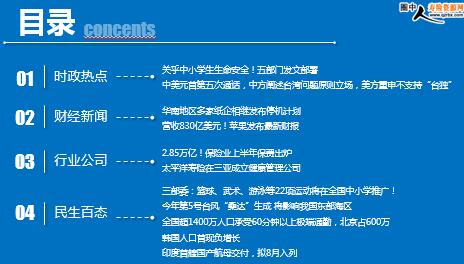 每日新闻速递 2022年7月30日 星期六 目录 时政热点 财经新闻 行业公司 民生百态 关乎中小学生生命安全!五部门发文部署 中美元首第五次通话,中方阐述台湾问题原则立场,美方重申不支持“台独” 华南地区多家纸企相继发布停机计划 营收830亿美元!苹果发布最新财报 2.85万亿!保险业上半年保费出炉 太平洋寿险在三亚成立健康管理公司 三部委:篮球、武术、游泳等22项运动将在全国中小学推广! 今年第5号台风“桑达”生成 将影响我国东部海区 全国超1400万人口承受60分钟以上极端通勤,北京占600万 韩国人口首现负增长 印度首艘国产航母交付,拟8月入列 时政热点 关乎中小学生生命安全!五部门发文部署 2022-07-29 13:36 来源:央视网 为尽最大努力减少学生溺水事件发生,切实保障学生生命安全,日前,教育部、公安部、民政部、水利部、农业农村部等五部门办公厅印发《关于做好预防中小学生溺水工作的通知》,部署做好相关工作。 对开放水域逐一摸排 评估风险排查隐患; 对危险水域开展常态化巡查; 设置防护设施 确保重点水域岸线全覆盖; 疏堵结合,开展技能培训。 中美元首第五次通话,中方阐述台湾问题原则立场,美方重申不支持“台独” 2022-07-2810:03 来源:澎湃新闻 北京时间7月28日晚,中国国家主席习近平应约同美国总统拜登通电话。拜登表示,当今世界正处于一个关键时期。美中合作不仅有利于两国人民,也有利于各国人民。美方希望同中方保持畅通对话,增进相互了解,避免误解误判,寻求在利益交融的领域开展合作,同时妥善管控分歧。他愿重申,美国的一个中国政策没有改变也不会改变,美方不支持台湾“独立”。
