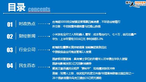 每日新闻速递 2022年8月13日 星期六 目录 时政热点 财经新闻 行业公司 民生百态 台湾超5000民众被骗至柬埔寨囚禁凌虐,不听话会被毒打 外交部:中尼同意将建跨喜马拉雅山铁路 小米发布全尺寸人形机器人 雷军:成本每台约六、七十万,尚无法量产 华为:上半年营收3016亿元 净利润率5.0% 前海财险董事长黄炜被调查 宝能集团紧急回应 中国银保监会河南监管局2人被查 国家移民管理局:具有博士学位的外籍华人可申请在华永久居留 国家电影局发放1亿元观影消费券 蔡英文宣讲遇民众呛声“要和平” 现场爆发肢体冲突 美媒:知情人士称,核武相关机密文件是FBI搜查特朗普庄园目标之一 26个国家同意向乌克兰提供15亿欧元援助 时政热点 台湾超5000民众被骗至柬埔寨囚禁凌虐,不听话会被毒打 2022-08-11 13:41 来源:北京晚报 台湾社会近日爆出重大诈骗案件,超过5000名台湾民众被诈骗集团以工作名义骗到柬埔寨等国家,却被扣押证件、遭受囚禁和凌虐。警方根据报警线索追查发现,诈骗集团以每月8万元新台币的薪酬为诱饵,将台湾民众骗到柬埔寨,但实际薪水却不到3万,强迫他们担任“假交友”、“假投资”的机房话务人员,每天工作超过12小时,如果不乖乖听话,就被毒打和电击。 外交部:中尼同意将建跨喜马拉雅山铁路 2022-08-11 11:34:40 来源:澎湃新闻 8月11日,外交部发言人汪文斌主持例行记者会。有外媒记者提问,中方是否希望在中国和尼泊尔之间修建铁路?会修建什么样的铁路? 汪文斌表示,中尼外长在会谈当中,双方一致表示将构建跨喜马拉雅立体互联互通网络。王毅国务委员兼外长也宣布,中方将使用对尼援款支持中尼跨境铁路的可行性研究,年内派专家赴尼开展踏勘。