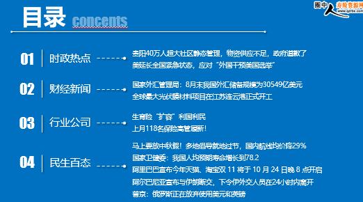 每日新闻速递 2022年9月9日 星期五 目录 时政热点 财经新闻 行业公司 民生百态 贵阳40万人超大社区静态管理,物资供应不足,政府道歉了 美延长全国紧急状态,应对“外国干预美国选举” 国家外汇管理局:8月末我国外汇储备规模为30549亿美元 全球最大光伏膜材料项目在江苏连云港正式开工 生育险“扩容”利国利民 上月118名保险高管履新! 马上要放中秋假!多地倡导就地过节,国内航线均价降29% 国家卫健委:我国人均预期寿命增长到78.2 阿里巴巴宣布今年天猫、淘宝双 11 将于 10 月 24 日晚 8 点开启 阿尔巴尼亚宣布与伊朗断交,下令伊外交人员在24小时内离开 普京:俄罗斯正在放弃使用美元和英镑 时政热点 贵阳40万人超大社区静态管理,物资供应不足,政府道歉了 2022-09-07 20:43 来源:央视新闻 据央视新闻消息,9月7日下午,贵阳贵安召开的新冠疫情防控新闻发布会上披露,截至7日14时,贵阳市共筛查到阳性感染者301例,较前日增加115例,此外,还有多管混检异常正在复核。 7日上午,贵阳南明区就花果园区域物资不足致歉。花果园社区是全国最大棚户区改造项目,有40万贵阳市民居住在这里,目前正处于静默管理中。 美延长全国紧急状态,应对“外国干预美国选举” 2022-09-07 13:35 来源:环球网 据俄罗斯卫星通讯社报道,美国总统拜登当地时间7日在一份声明中表示,在今年秋季中期选举之前,他将延长为应对“外国干涉美国选举”而实施的全国紧急状态。 白宫官网7日发布了署名为美国总统拜登,题为“给众议院议长和参议院议长关于外国干涉或破坏公众对美国选举信心的、继续(实施)国家紧急状态的信”。