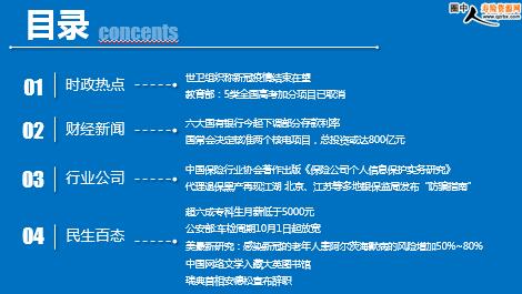 每日新闻速递 2022年9月16日 星期五 目录 时政热点 财经新闻 行业公司 民生百态 世卫组织称新冠疫情结束在望 教育部:5类全国高考加分项目已取消 六大国有银行今起下调部分存款利率 国常会决定核准两个核电项目,总投资或达800亿元 中国保险行业协会著作出版《保险公司个人信息保护实务研究》 代理退保黑产再现江湖 北京、江苏等多地银保监局发布“防骗指南” 超六成专科生月薪低于5000元 公安部:车检周期10月1日起放宽 美最新研究:感染新冠的老年人患阿尔茨海默病的风险增加50%~80% 中国网络文学入藏大英图书馆 瑞典首相安德松宣布辞职 时政热点 世卫组织称新冠疫情结束在望 2022-09-15 08:00 来源:券商中国 据海外网援引路透社14日报道,世卫组织总干事谭德塞在当天的线上新闻发布会上表示,新冠肺炎疫情的结束“近在眼前”,世界现在处于战胜疫情的最佳时机,世卫组织呼吁各国继续坚持抗击疫情。 谭德塞在新闻发布会上说:“我们从未处于结束这一流行病的更好位置。虽然我们还没有走到结束疫情的那一步,但疫情结束就在眼前。”谭德塞表示,上个星期新冠死亡病例数是自2020年3月以来的最低水平。世卫组织呼吁所有国家投入为包括卫生工作者和老年人在内高危人群接种疫苗,并继续对新冠病毒进行检测。 世界卫生组织于2020年3月11日宣布新冠疫情为大流行。根据世界卫生组织的数据,截至今年9月11日,全球累计已有超过6.05亿人感染新冠病毒,死亡人数超过640万。 教育部:5类全国高考加分项目已取消 2022-09-15 13:06 来源:光明日报 记者从今日召开的教育部新闻发布会上获悉,近年来,教育部清理规范高考加分,目前,已取消5类全国性高考加分项目,逐步取消95类地方性加分项目。2015年、2019年,教育部会同有关部门按照“促进公平、规范管理、科学精准”的原则,先后开展了两轮清理和规范高考加分工作,明确取消体育特长生、中学生奥林匹克竞赛、科技类竞赛、省级优秀学生、思想品德有突出事迹等五类全国性高考加分项目,指导各地减少地方性加分项目,进一步降低加分分值。