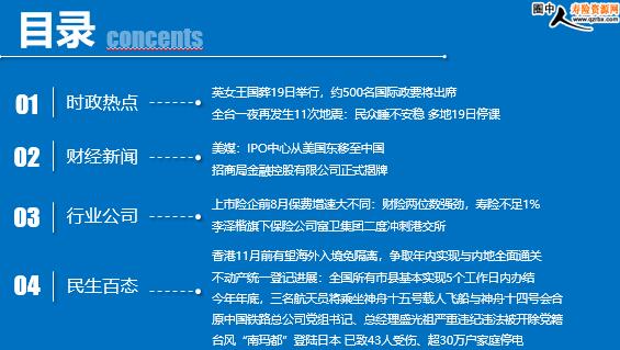 每日新闻速递 2022年9月20日 星期二 目录 时政热点 财经新闻 行业公司 民生百态 英女王国葬19日举行,约500名国际政要将出席 全台一夜再发生11次地震:民众睡不安稳 多地19日停课 美媒:IPO中心从美国东移至中国 招商局金融控股有限公司正式揭牌 上市险企前8月保费增速大不同:财险两位数强劲,寿险不足1% 李泽楷旗下保险公司富卫集团二度冲刺港交所 香港11月前有望海外入境免隔离,争取年内实现与内地全面通关 不动产统一登记进展:全国所有市县基本实现5个工作日内办结 今年年底,三名航天员将乘坐神舟十五号载人飞船与神舟十四号会合 原中国铁路总公司党组书记、总经理盛光祖严重违纪违法被开除党籍 台风“南玛都”登陆日本 已致43人受伤、超30万户家庭停电 时政热点 英女王国葬19日举行,约500名国际政要将出席 2022年9月19日14:38 来源:武汉晨报 据外媒报道,英国女王伊丽莎白二世的葬礼将于当地时间今日(9月19日)上午11点(北京时间下午6点)在伦敦威斯敏斯特教堂开始,她将安葬在温莎城堡的乔治六世国王纪念堂,与她的丈夫菲利普亲王合葬在一起。 据路透社报道,预计有超过2000名宾客将出席女王的葬礼,其中包括近200个国家和地区的约500名政要,里面有近100位国家元首和政府首脑,以及超过20位王室成员。此外,还有近200名为慈善和社区工作的普通民众也将受邀出席。 全台一夜再发生11次地震:民众睡不安稳 多地19日停课 2022-09-19 06:54 来源:海外网 据台湾中时新闻网报道,台湾地区台东县池上乡18日14时44分发生今年规模最大地震后,全台余震持续不断。从19日0时起,一整晚再发生11次地震。 19日0时起至凌晨发生的余震均属于极浅层地震,规模从3.1到4.4不等,震中全在花东地区,遍布花莲县万荣乡、玉里镇、台东县池上乡、延平乡、台东县东河乡。一夜震不停,民众睡不安稳。
