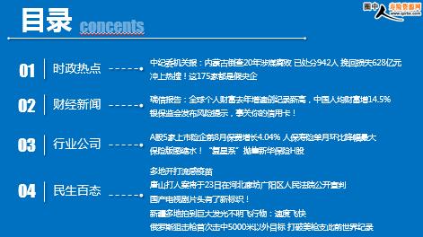 每日新闻速递 2022年9月23日 星期五 目录 时政热点 财经新闻 行业公司 民生百态 中纪委机关报:内蒙古倒查20年涉煤腐败 已处分942人 挽回损失628亿元 冲上热搜!这175家都是假央企 瑞信报告:全球个人财富去年增速创纪录新高,中国人均财富增14.5% 银保监会发布风险提示,事关你的信用卡! A股5家上市险企前8月保费增长4.04% 人保寿险单月环比降幅最大 保险版图缩水!“复星系”抛售新华保险H股 多地开打流感疫苗 唐山打人案将于23日在河北廊坊广阳区人民法院公开宣判 国产电视剧片头有了新标识! 新疆多地拍到巨大发光不明飞行物:速度飞快 俄罗斯狙击枪首次击中5000米以外目标 打破美枪支此前世界纪录 时政热点 中纪委机关报:内蒙古倒查20年涉煤腐败 已处分942人 挽回损失628亿元 2022-09-22 08:00 来源:澎湃新闻 内蒙古倒查20年涉煤腐败,目前已查处案件789件1163人,给予党纪政务处分942人,追缴挽回损失628亿元,清收处置煤炭资源299亿吨。 9月22日,《中国纪检监察报》发布消息称,两年多来,内蒙古自治区党委按照党中央要求,针对白向群、邢云、云光中等人案件暴露出的内蒙古煤炭资源领域深层次问题,以高压之势专项整治煤炭资源领域违规违法问题,在解决一批重大问题、查办一批重大案件、挽回一批国有资产损失、堵塞一批制度监管漏洞方面收获了累累战果。 冲上热搜!这175家都是假央企 2022-09-21 13:06 来源:澎湃新闻 据国务院国资委网站消息,9月20日,国务院国资委发布了第二批假冒中央企业名单。 国务院国资委表示,近期,部分中央企业对外公告了一批假冒国企名单,明确有关公司及其下设各级子公司均为假冒国企,与中央企业无任何隶属或股权关系,也不存在任何投资、合作、业务等关系,其一切行为均与中央企业无关。现将中央企业公告的假冒国企名单汇总公布,请社会各界提高警惕,注意防范风险,如发现其违法犯罪行为,请尽快到公安机关报案。
