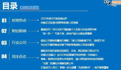 每日新闻速递 2022年10月8日 星期六 目录 时政热点 财经新闻 行业公司 民生百态 2022年诺贝尔奖陆续出炉 欧盟正式批准对俄罗斯的第八轮制裁 重磅发布!央行决定下调首套个人住房公积金贷款利率 “卖一买一”可退个税,房地产信心比黄金更重要 保险公司服务质量排行揭晓!7家公司指数高于90,3家低于60 央企巨无霸招商金控旗下两家香港保险公司迎来重组 携程发布国庆旅游总结报告,本地、周边旅游订单达65% 欧盟立法通过!自2024年起智能手机使用单一充电接口 海南:倡导和支持男女共担家务,缩小两性家务劳动时间差距 “北溪”泄漏初步调查结果公布 已造成36人死亡!泰国一幼儿园遭“无差别射杀”,枪手曾是警察 时政热点 2022年诺贝尔奖陆续出炉 2022-10-04 21:52 来源:澎湃新闻 北京时间10月5日下午,在瑞典首都斯德哥尔摩,瑞典皇家科学院宣布,将2022年诺贝尔化学奖授予美国化学家卡罗琳·贝尔托西(Carolyn R. Bertozzi)、丹麦化学家摩顿·梅尔达尔(Morten Meldal)和美国化学家卡尔·巴里·夏普利斯(K. Barry Sharpless),以表彰他们在点击化学和生物正交化学研究方面的贡献。 北京时间10月4日下午,在瑞典首都斯德哥尔摩,瑞典皇家科学院宣布,将2022年诺贝尔物理学奖授予法国物理学家阿兰·阿斯佩(Alain Aspect)、美国理论和实验物理学家约翰·弗朗西斯·克劳泽(John F. Clauser) 和奥地利物理学家安东·塞林格(Anton Zeilinger),以表彰他们在量子信息科学研究方面作出的贡献。 当地时间10月6日,瑞典文学院宣布,将2022年诺贝尔文学奖授予法国作家安妮·埃尔诺(Annie Ernaux)。 欧盟正式批准对俄罗斯的第八轮制裁 2022-10-06 18:05 来源:央视新闻 欧盟委员会10月6日表示,欧盟已批准对俄罗斯实施新一轮制裁。其官网当日发布新一轮制裁措施的一揽子方案。 捷克驻欧盟大使赫达此前表示,欧盟成员国5日上午已就新一轮对俄制裁草案达成共识,具体制裁措施在欧盟官方日志上公布后,随即生效。