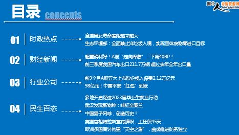 每日新闻速递 2022年10月22日 星期六 目录 时政热点 财经新闻 行业公司 民生百态 热点 全国男女寿命差距越来越大 生态环境部:全面禁止洋垃圾入境,实现固体废物零进口目标 超重磅利好!A股“定向降息”:下调40BP! 前三季度我国汽车出口211.7万辆 超过去年全年出口量 前9个月A股五大上市险企揽入保费2.12万亿元 98亿元!中国平安“红包”到账 多地开启促进2023届毕业生就业行动 武汉发现新物种:绯红金粟兰 中国男子网球,创造历史! 英国首相特拉斯宣布辞职,上任仅45天 欧洲多国商讨构建“天空之盾”,曲线推进防务独立 时政热点 全国男女寿命差距越来越大 2022年10月21日 14:42 来源:界面新闻 10月以来,全国至少有山东、安徽等4个省份公布了各省最新人均期望寿命。2022年以来,截至10月20日,全国31个省份已有17个公布了2021年各省人均预期寿命。 界面数据统计发现,截至10月19日,全国31个省份中就有14个超过我国人均预期寿命值78.2岁。除西藏外,我国其他省份均已超过世界人均预期寿命值73.7岁。此外,还有4个省份的人均预期寿命大于80岁,上海以84.11岁居于首位。 从国家统计局公布的数据来看,女性预期寿命增速高于男性,这也导致近年来我国女性与男性人均预期寿命差距逐渐被拉大。2015年女性人均预期寿命较2010年增长2.66%,而男性仅增长1.74%。在2000年、2005年、2010年、2015年这四个年份,女性与男性人均预期寿命的差值分别为3.7岁、4.42岁、4.99岁、5.79岁。 生态环境部:全面禁止洋垃圾入境,实现固体废物零进口目标 2022-10-21 08:17:00 来源:澎湃新闻 10月21日上午,二十大新闻中心举行第五场记者招待会。记者招待会围绕“建设人与自然和谐共生的美丽中国”主题与记者交流。 生态环境部党组成员、副部长翟青介绍,“污染防治攻坚向纵深推进。2021年,全国地级以上城市PM2.5的平均浓度比2015年下降了34.8%,空气质量优良天数的比率达到了87.5%;地表水I—III类断面比例达到84.9%,劣Ⅴ类水体比例下降到1.2%;全面禁止洋垃圾入境,我国实现固体废物零进口目标。