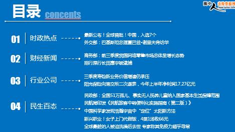 每日新闻速递 2022年10月27日 星期四 目录 时政热点 财经新闻 行业公司 民生百态 热点 最新公布!全球首批!中国,入选7个 外交部:巴基斯坦总理夏巴兹•谢里夫将访华 商务部:前三季度我国网络零售市场总体呈增长态势 招行原行长田惠宇被逮捕 三季度寿险新业务价值增速仍承压 阳光保险向港交所二次递表,今年上半年净利润17.27亿元 民政部:全国51万孤儿、事实无人抚养儿童纳入国家基本生活保障范围 民航局印发《民航旅客中转便利化实施指南(第二版)》 中国科学家发现浩瀚宇宙中“定位”太阳新方法 新兴职业!女子上门代做饭,4菜1汤收66元 全球最脏的人被迫洗澡后去世 专家称其免疫力超乎寻常 时政热点 最新公布!全球首批!中国,入选7个 2022年10月26日 14:42 来源:央视财经 北京时间2022年10月26日,国际地质科学联合会(IUGS)在西班牙公布全球第一批地质遗产地名录,浙江长兴“金钉子”地质剖面等7个中国地质遗迹成功入选 ,我国是本次评选中入选地质遗产地最多的国家之一。 同天,在浙江省湖州市长兴县举行中国入选的7个地质遗产地的发布会。 国家级地质遗迹保护区《长兴煤山二叠纪/三叠纪生物大灭绝和“金钉子”》,世界地质公园《内蒙古巴丹吉林沙漠必鲁特高大沙山和湖泊》《香港早白垩世酸性火成岩柱状节理》《云南石林喀斯特》,世界自然遗产和国家地质公园《云南澄江寒武纪化石产地和化石库》《藏南绒布峡谷滑脱构造体系》《珠峰奥陶纪岩石》等7个地质遗产入选。 外交部:巴基斯坦总理夏巴兹•谢里夫将访华 2022-10-26 08:17:00 来源:环球网 外交部发言人汪文斌宣布:应国务院总理李克强邀请,巴基斯坦伊斯兰共和国总理夏巴兹•谢里夫将于11月1日起对中国进行正式访问。