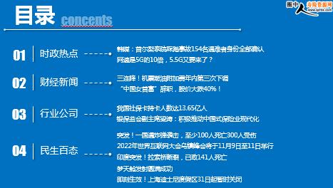 每日新闻速递 2022年11月1日 星期一 目录 时政热点 财经新闻 行业公司 民生百态 热点 韩媒:首尔梨泰院踩踏事故154名遇难者身份全部确认 网速是5G的10倍,5.5G又要来了? 三连降!机票燃油附加费年内第三次下调 “中国女首富”辞职,股价大跌40%! 我国社保卡持卡人数达13.65亿人 银保监会副主席梁涛:积极推动中国式保险业现代化,为实现共同富裕保驾护航 突发!一国遇炸弹袭击,至少100人死亡300人受伤 2022年世界互联网大会乌镇峰会将于11月9日至11日举行 印度突发!拉索桥断裂,已致141人死亡 梦天舱发射圆满成功 即刻生效!上海迪士尼度假区31日起暂时关闭 时政热点 韩媒:首尔梨泰院踩踏事故154名遇难者身份全部确认 2022年10月31日 14:42 来源:每日经济新闻 综合韩媒31日消息,韩国梨泰院踩踏事故已造成154人遇难,目前遇难者身份已全部得到确认。 正在调查韩国首尔梨泰院大规模踩踏事故的首尔警察厅调查本部31日表示,警方通过指纹鉴定和DNA信息分析等,已经确认了在此次事故中遇难的154人的身份。另据韩联社消息,遇难者中包括来自中国、伊朗、俄罗斯、美国、日本、澳大利亚等国的26名外国人。 网速是5G的10倍,5.5G又要来了? 2022-10-31 08:17:00 来源:每日经济新闻 在近日举行的2022全球移动宽带论坛“5.5G与2030智能世界”媒体圆桌上,GSMA(全球移动通信系统协会)首席技术官Alex Sinclair表示,根据3GPP标准节奏,预计5.5G将于2024年进入商用阶段。5.5G对比5G会有能力的持续增强,比如10倍网速的提升,新的物联、感知能力。