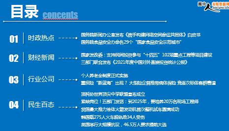 每日新闻速递 2022年11月8日 星期二 目录 时政热点 财经新闻 行业公司 民生百态 热点 国务院新闻办公室发布《携手构建网络空间命运共同体》白皮书 国务院食品安全办命名29个“国家食品安全示范城市” 国家发改委:支持民间投资参与“十四五”102项重点工程等项目建设 三部门联合发布《2021年度中国对外直接投资统计公报》 个人养老金制度正式实施 重疾险“新蓝海”出现? 大型险企首推带病体保险 竞逐次标体客群赛道 顶科协世界顶尖中学联盟宣布成立 紧缺岗位!五部门发话:到2025年,要培养20万名现场工程师 我国最大推力液体火箭发动机首次整机试车圆满成功 韩国载275人火车脱轨致34人受伤 英国举行大规模抗议,46.5万人要求提前大选 时政热点 国务院新闻办公室发布《携手构建网络空间命运共同体》白皮书 2022-11-07 10:12 来源:央视新闻 国务院新闻办公室7日发布《携手构建网络空间命运共同体》白皮书。白皮书介绍了新时代中国互联网发展和治理理念与实践,分享中国推动构建网络空间命运共同体的积极成果,展望网络空间国际合作前景。 白皮书指出,随着新一轮科技革命和产业变革加速推进,互联网让世界变成了“地球村”,国际社会越来越成为你中有我、我中有你的命运共同体。发展好、运用好、治理好互联网,让互联网更好造福人类,是国际社会的共同责任。 白皮书介绍,作为全球最大的发展中国家和网民数量最多的国家,中国顺应信息时代发展趋势,坚持以人民为中心的发展思想,秉持共商共建共享的全球治理观,推动构建网络空间命运共同体。 国务院食品安全办命名29个“国家食品安全示范城市” 2022-11-07 11:12 来源:央视新闻 日前,经报请国务院食品安全委员会批准,国务院食品安全办正式命名29个城市为“国家食品安全示范城市”。 北京市东城区、西城区、海淀区等29个城市(区)自创建以来,不断夯实食品安全工作基础,压实食品安全各方责任,提升食品安全保障水平,本地区食品安全状况总体平稳向好,社会认可、群众满意,最终通过国家评审验收,获得“国家食品安全示范城市”荣誉称号。
