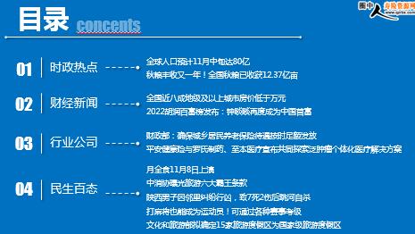 每日新闻速递 2022年11月9日 星期三 目录 时政热点 财经新闻 行业公司 民生百态 热点 全球人口预计11月中旬达80亿 秋粮丰收又一年!全国秋粮已收获12.37亿亩 全国近八成地级及以上城市房价低于万元 2022胡润百富榜发布:钟睒睒再度成为中国首富 财政部:确保城乡居民养老保险待遇按时足额发放 平安健康险与罗氏制药、至本医疗宣布共同探索泛肿瘤个体化医疗解决方案 月全食11月8日上演 中消协曝光旅游六大霸王条款 陕西男子因邻里纠纷行凶,致7死2伤后跳河自杀 打麻将也能成为运动员!可通过各种赛事考级 文化和旅游部拟确定15家旅游度假区为国家级旅游度假区 时政热点 全球人口预计11月中旬达80亿 2022-11-07 10:12 来源:澎湃新闻 联合国数据显示,全球人口将于11月15日达到80亿。 据法新社11月7日报道,联合国人口基金执行主任卡内姆(Natalia Kanem)表示,80亿人口对人类来说是“重要里程碑”。她表示,人类寿命延长、孕产妇和儿童死亡人数减少是值得欢迎的。 秋粮丰收又一年!全国秋粮已收获12.37亿亩 2022-11-08 11:12 来源:人民日报 从东北平原到华北粮仓,再到鱼米之乡,稻香阵阵,仓廪殷实。据农业农村部11月7日农情调度显示,全国秋粮已收获12.37亿亩、完成94.7%,进度同比相当,全国秋粮丰收在望。与此同时,全国冬小麦已播91.9%,冬油菜已播94.4%。 习近平总书记在党的二十大报告中指出,“全方位夯实粮食安全根基”“全面落实粮食安全党政同责”。总书记经常叮咛:“粮食安全是‘国之大者’。”“保障粮食等重要农产品供给安全,是‘三农’工作头等大事。”