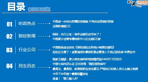 每日新闻速递 2022年11月12日 星期六 目录 时政热点 财经新闻 行业公司 民生百态 热点 中国进一步优化疫情防控措施 不再判定密接的密接 全国新增超1万 刚刚,央行公布!兔年金银纪念币来了! 中国累计培育专精特新中小企业超6万家 中国银保监会发布《绿色保险业务统计制度的通知》 各险企注意了!监管通报私募股权基金管理人不良记录名单 叫停合作 国家卫健委:累计报告接种新冠病毒疫苗344087.9万剂次 中国七城市获认证 正式跻身“国际湿地城市” 最高法、最高检、教育部联合发布意见 严格执行犯罪人员从业禁止制度 今年下半年首个暴雪预警发布 官宣!“第三艘入列” 时政热点 中国进一步优化疫情防控措施 不再判定密接的密接 2022年11月11日12:23 来源:中新网 据国家卫健委微信公众号消息,11日,国务院应对新型冠状病毒肺炎疫情联防联控机制综合组发布《关于进一步优化新冠肺炎疫情防控措施 科学精准做好防控工作的通知》。通知要求,对密切接触者,将“7天集中隔离+3天居家健康监测”管理措施调整为“5天集中隔离+3天居家隔离”,期间赋码管理、不得外出。集中隔离医学观察的第1、2、3、5天各开展1次核酸检测,居家隔离医学观察第1、3天各开展1次核酸检测。 通知强调,及时准确判定密切接触者,不再判定密接的密接。将高风险区外溢人员“7天集中隔离”调整为“7天居家隔离”,期间赋码管理、不得外出。在居家隔离第1、3、5、7天各开展1次核酸检测。 全国新增超1万 2022-11-11 11:12 来源:中国银行保险报 11月10日0—24时,31个省(自治区、直辖市)和新疆生产建设兵团报告新增新冠肺炎本土确诊病例1150例。 31个省(自治区、直辖市)和新疆生产建设兵团报告新增本土无症状感染者9385例。