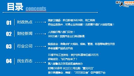 每日新闻速递 2022年11月22日 星期二 目录 时政热点 财经新闻 行业公司 民生百态 热点 国家卫健委:昨日新增26824例,死亡两例 四大重磅文件齐发!符合这些条件,可停止全员核酸!无疫情不得扩大核检范围! 人民银行等八部门印发! 300万辆!我国汽车出口再创新高 银保监会:将稳步扩大规则、规制、管理、标准等制度性开放 养老储蓄产品试点开启 31省平均工资发布:京沪非私营单位超19万元 研制成功,飞行汽车来了! 第八届鲁迅文学奖颁奖盛典举办 时隔150多年 长江口二号古船“重见天日” 首尔再爆集会,韩媒:“20万抗议者”促尹锡悦下台 时政热点 国家卫健委:昨日新增26824例,死亡两例 2022-11-21 10:52 来源:国家卫健委 11月20日0—24时,31个省(自治区、直辖市)和新疆生产建设兵团报告新增确诊病例2365例。其中境外输入病例88例,含7例由无症状感染者转为确诊病例;本土病例2277例,含787例由无症状感染者转为确诊病例。新增死亡病例2例,均为本土病例,在北京;无新增疑似病例。 31个省(自治区、直辖市)和新疆生产建设兵团报告新增无症状感染者24730例,其中境外输入183例,本土24547例。 四大重磅文件齐发!符合这些条件,可停止全员核酸!无疫情不得扩大核检范围! 2022-11-21 15:06 来源:券商中国 据国家卫健委11月21日消息,国务院联防联控机制综合组制定了《新冠肺炎疫情防控核酸检测实施办法》《新冠肺炎疫情风险区划定及管控方案》《新冠肺炎疫情居家隔离医学观察指南》《新冠肺炎疫情居家健康监测指南》。 《新冠肺炎疫情防控核酸检测实施办法》:不得扩大核酸检测范围,一般不按行政区域开展全员核酸检测。 《新冠肺炎疫情风险区划定及管控方案》:五种情形的确诊病例和无症状感染者,不纳入风险区域判定。 《新冠肺炎疫情居家健康监测指南》:街道(镇)、社区(村)应组织专人负责居家健康监测人员的管理,落实24小时值班制度。 《新冠肺炎疫情居家隔离医学观察指南》:居家隔离医学观察人员需根据相关防控要求配合工作人员完成核酸检测、抗原自测和结果上报。