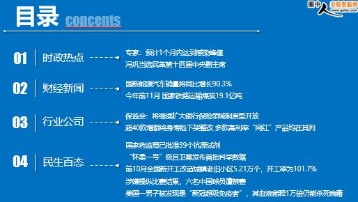 每日新闻速递 2022年12月12日 星期一 目录 时政热点 财经新闻 行业公司 民生百态 专家:预计1个月内达到感染峰值 冯巩当选民革第十四届中央副主席 国新能源汽车销量将同比增长90.3% 今年前11月 国家铁路运输煤炭19.1亿吨 保监会:将继续扩大银行保险领域制度型开放 超40款增额终身寿险下架整改 多款高利率“网红”产品均在其列 国家药监局已批准39个抗原试剂 “怀柔一号”极目卫星发布首批科学数据 前10月全国新开工改造城镇老旧小区5.21万个,开工率为101.7% 涉嫌操纵比赛结果,六名中国球员遭禁赛 美国一男子被发现是“新冠超级免疫者”,其血液稀释1万倍仍能杀死病毒 时政热点 专家:预计1个月内达到感染峰值 2022-12-11 16:03 来源:第一财经 复旦大学附属中山医院重症医学科主任钟鸣在接受媒体采访时表示,新冠阳性居家隔离,事实上就意味着新冠会在社会面传播,但也是防疫措施优化下的重要一步。预计来看,新冠疫情的走势会在1个月之内达到感染峰值。但之后何时才能结束,这一模型就会比较复杂。原因是,病毒感染和恢复并不是发生在同一时间。从医疗机构的角度来说,同一时间感染会造成人员集聚和医疗资源的紧张;因此,有序、逐步地就医,可以使医疗机构有更强的应对能力,但相对这一周期也会拉长。 冯巩当选民革第十四届中央副主席 2022-12-11 15:40 来源:中国新闻网 据新华社消息,中国国民党革命委员会第十四次全国代表大会于12月10日在京闭幕。会议期间举行的中国国民党革命委员会第十四届中央委员会第一次全体会议选举产生了由48人组成的第十四届中央常务委员会,郑建邦当选主席,何报翔、刘家强、李惠东、田红旗、王红、冯巩、吴晶、欧阳泽华、谷振春、陈星莺当选副主席。