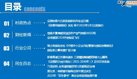 每日新闻速递 2022年12月27日 星期二 目录 时政热点 财经新闻 行业公司 民生百态 全国铁路今日起实施新的列车运行图 《体育仲裁规则》发布 将于2023年1月1日起施行 塔里木富满超深油田年产油气突破300万吨 全球首架C919开启验证飞行 瑞士再保险发布《中国中小企业风险管理与保险发展报告》 保险系公募有望扩至10家 新晋高速正式建成通车 三层螺旋隧道群穿越大山腹地 《全国防沙治沙规划(2021-2030年)》正式印发实施 71架战机 台军通报解放军大机群抵近台湾 美议员:特朗普可能将在狱中度过余生 2023年“欢乐春节”将在全球各地陆续开展 时政热点 全国铁路今日起实施新的列车运行图 2022-12-26 14:24 来源:中国铁路 12月26日零时起,全国铁路实行2023年一季度列车运行图。 调图后,全国铁路开行旅客列车6046对,较现图增加63对;开行货物列车10894对,较现图增加50对。 铁路部门全面贯彻落实党的二十大精神和中央经济工作会议部署,更好统筹疫情防控和运输组织,持续深化铁路运输供给侧结构性改革,根据国家优化疫情防控措施后运输需求变化,充分运用年底新线开通资源,对全国铁路客货列车开行方案进行集中优化调整,以进一步提升运输能力和效率,强化路网整体功能,为国民经济平稳运行和人民群众生产生活提供运输保障。 《体育仲裁规则》发布 将于2023年1月1日起施行 2022-12-26 11:51 来源:中国新闻网 近日国家体育总局网站发布《体育仲裁规则》和《中国体育仲裁委员会组织规则》,两项规则将于2023年1月1日起施行。