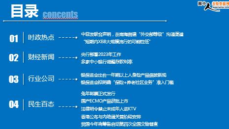每日新闻速递 2023年1月6日 星期五 目录 时政热点 财经新闻 行业公司 民生百态 中菲发联合声明,在南海首建“外交部等级”沟通渠道 “短期内XBB大规模流行的可能性低” 央行部署2023年工作 多家中小银行调整存款利率 银保监会出台一年期以上人身险产品信披新规 银保监会拟明确“保险+养老社区业务”准入门槛 兔年邮票正式发行 国产ECMO产品获批上市 法律明令禁止未成年人进KTV 香港公布与内地通关首阶段安排 我国今年将筹备启动第四次全国文物普查 时政热点 中菲发联合声明,在南海首建“外交部等级”沟通渠道 2023-01-05 11:59 来源:国防时报 新年伊始,菲律宾总统马科斯对中国进行了为期三天的国事访问,中菲两国领导人会晤后,对外发布了联合声明。据来自观察者网的报道,联合声明一共二十八条,除了菲方的感谢和祝愿外,多条提到了“南海问题”,但双方也明确表示“南海问题不是中菲关系的全部”,并首次建立了“外交部等级”的沟通渠道,还提到共同开发。此外,在两国联合声明中,马科斯还郑重承诺,将继承先父遗志,继续提升中菲两国关系。 “短期内XBB大规模流行的可能性低” 2023-01-05 09:27 来源:国际金融报 中国疾控中心1月4日发布信息显示,我国目前本土流行的新冠病毒绝对优势毒株是BA.5.2和BF.7,个体在感染BA.5.2或BF.7后产生的中和抗体,在短期内(3个月)会维持相对较高水平,预期对其他奥密克戎变异株分支(包括XBB)有较好的交叉保护作用。我国短期内,由XBB系列变异株包括XBB.1.5引发大规模流行的可能性低。