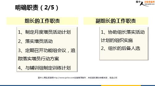 支持功能组建立五步走 增员功能组的建立 组长:1人 副组长:1人 基本法专员:1人 活动专员:1人 辅导专员:1人 拟搭架构 1、建立增员支持功能组的意义 对主管 对伙伴 对团队 提升管理技能分担工作压力 展现个人才能和特长提升个人知名度提升增员技能提高个人综合能力熟悉团队管理运作要领奠定团队管理基础 培养后备主管打造和谐可持续发展的团队 意愿启动(1/2) 2、增支功能组组建要求 架构设置:组长1人,副组长1人,专员3人任职条件:组长必须是主管副组长(专员)可以是主管,也可以是精英所有人员必须具有奉献、勤劳、吃苦精神本人有意愿 意愿启动(2/2) 跟2位组经理面谈 1、强化意愿个人领导能力管理能力还必须赶紧学,不然团队带不大对接标建“增支功能组”可以优势互补,资源共享容易发现本组增员人才,培养后备主管 2、你是否愿意出任增支功能组组(副)长? 3、你觉得你组哪些伙伴适合加入增员支持功能组? 分层面谈(1/2) 跟3位精英面谈 1、你觉得业务员的收入稳定还是组经理的收入稳定?你认为主管学习的机会多还是业务员的学习机会多?你认为营销员有面子些还是当主管有面子些? 2、增员支持能够能够让你学到很多知识和技能、交到很多朋友,你愿意继续参加吗? 分层面谈(2/2) 人员确定(1/2) 组长/副组长:综合考量专员人选:本人意愿+个人综合能力+组(副)长意见 组长:xx 副组长:xx 基本法专员:xx 活动专员:xx 辅导专员:xx 人员确定(2/2) 职场经理的职责 1、组建增员功能组、制定功能组职责 2、明确阶段增员目标,指导、追踪增员活动 3、定期组织功能小组例会,指导功能小组的运作 4、增员功能组的维护,协调与其他功能小组的衔接 5、每月对下级主管进行规划面谈