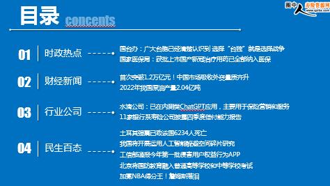 每日新闻速递 2023年2月9日 星期四 目录 时政热点 财经新闻 行业公司 民生百态 国台办:广大台胞已经清楚认识到 选择“台独”就是选择战争 国家医保局:获批上市国产新冠治疗用药已全部纳入医保 首次突破1.2万亿元!中国市场吸收外资量质齐升 2022年我国原油产量2.04亿吨 水滴公司:已在内测类ChatGPT应用,主要用于保险营销和服务 11家银行系寿险公司披露四季度偿付能力报告 土耳其强震已致该国6234人死亡 我国将开展运用人工智能躲避空间碎片研究 工信部通报今年第一批侵害用户权益行为APP 北京将国防教育融入普通高等学校和中等学校考试 加冕NBA得分王!詹姆斯落泪 时政热点 国台办:广大台胞已经清楚认识到 选择“台独”就是选择战争 2023-02-08 09:32 来源:海外网 2月8日上午,国台办在新闻发布厅举行例行新闻发布会。发言人朱凤莲就近期两岸热点问题回答记者提问。 问:美国会众议院“中国特设委员会”成员日前扬言称,将赴台举行对台军售听证会。对此有何评论? 朱凤莲:台湾是中国的台湾。我们坚决反对美国与中国台湾地区开展任何形式的官方往来和军事联系。敦促美国会恪守美国在涉台问题上所作严肃承诺,停止向民进党当局和“台独”势力释放错误信号。 广大台胞已经清楚认识到,选择“台独”就是选择战争,民进党当局妄图“以武谋独”只会把台湾推向更加危险的境地。 国家医保局:获批上市国产新冠治疗用药已全部纳入医保 2023-02-08 09:27 来源:澎湃新闻 目前,获批上市的国产新冠治疗用药已全部被纳入医保支付范围。其中,中药“三药三方”和阿兹夫定片已正式纳入医保药品目录,氢溴酸氘瑞米德韦片、先诺特韦片/利托那韦片组合包装等药品临时性纳入医保支付范围。
