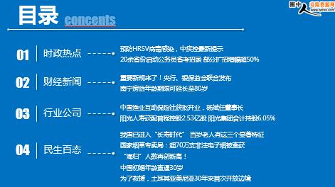 每日新闻速递 2023年1月30日 星期一 目录 时政热点 财经新闻 行业公司 民生百态 预防HRSV病毒感染,中疾控最新提示 20余省份启动公务员省考招录 部分扩招增幅超50% 重要新规来了!央行、银保监会联合发布 南宁房贷年龄期限可延长至80岁 中国渔业互助保险社获批开业,杨斌任董事长 阳光人寿获配首程控股2.53亿股 阳光集团合计持股6.05% 我国已进入“长寿时代” 百岁老人有这三个显著特征 国家烟草专卖局:超70万支非法电子烟被查获 “海归”人数再创新高! 中国初婚年龄直逼30岁 为了救援,土耳其亚美尼亚30年来首次开放边境 时政热点 预防HRSV病毒感染,中疾控最新提示 2023-02-11 09:32 来源:澎湃新闻 近期,全国新冠感染疫情日趋平稳,总体向好态势持续巩固。专家提醒,冬春季节是各类呼吸道传染病的高发季,除了新冠病毒,一些其他病原体也会攻击人体的呼吸道和肺部,中国疾控中心健康传播中心公布信息显示,HRSV为肺炎病毒科,正肺病毒属的RNA病毒。HRSV感染后,潜伏期通常为2-8天,临床表现以呼吸道感染症状为主,早期HRSV感染大部分局限于上呼吸道,临床表现如鼻塞、流涕、咳嗽和声音嘶哑等。 北京大学人民医院呼吸内科主任高占成表示,对于易感人群的预防,要注意勤洗手,避免不洁净的手触摸眼、口、鼻,养成良好的个人卫生习惯,及时佩戴口罩,减少出入人员密集场所。 20余省份启动公务员省考招录 部分扩招增幅超50% 2023-02-12 09:27 来源:新湖南 近日,全国多省份陆续开启公务员省考报名,并将于2月底至3月开始笔试,其中部分省份扩招增幅超50%。 据华图教育公开资料显示,2月25日开始省考笔试的有:安徽、重庆、福建、甘肃、广西、贵州、海南、河北、河南等24省(区、市)。其中甘肃2022年全省计划招录公务员2364名,2023年计划招录4249名,同比增长约79.7%,云南、广西、内蒙古均同比扩招50%以上。 2023年,陕西、上海、四川、湖南、吉林、深圳6个地区缩招,其中陕西、上海缩招幅度较小,基本与去年持平。