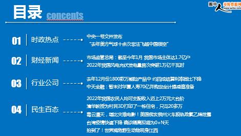 每日新闻速递 2023年2月15日 星期三 目录 时政热点 财经新闻 行业公司 民生百态 中央一号文件发布 “去年美方气球十余次非法飞越中国领空” 市场监管总局:截至今年1月 我国市场主体达1.7亿户 2022年我国风电光伏发电量首次突破1万亿千瓦时 去年12月份1800款万能险产品中 约四成结算利率同比下降 巨亏超百亿收深交所监管函 中天金融:暂未对华夏人寿70亿并购定金计提减值准备 2022年我国农民人均可支配收入迈上2万元大台阶 清华教授为村民3D打印了一栋住宅,只花20多万 毒云漫天,堪比灾难电影!美国俄亥俄州火车脱轨致氯乙烯泄露 台湾疫情快速下降 确诊隔离拟调为0+N天 拍到了!世界濒危野生动物现身江西 时政热点 中央一号文件发布 2023-02-13 09:32 来源:北京日报 《中共中央 国务院关于做好2023年全面推进乡村振兴重点工作的意见》13日由新华社受权发布。 意见指出: 加强农村精神文明建设。深入开展社会主义核心价值观宣传教育,继续在乡村开展听党话、感党恩、跟党走宣传教育活动。深化农村群众性精神文明创建,拓展新时代文明实践中心、县级融媒体中心等建设,支持乡村自办群众性文化活动。注重家庭家教家风建设。深入实施农耕文化传承保护工程,加强重要农业文化遗产保护利用。办好中国农民丰收节。推动各地因地制宜制定移风易俗规范,强化村规民约约束作用,党员、干部带头示范,扎实开展高价彩礼、大操大办等重点领域突出问题专项治理。推进农村丧葬习俗改革。 “去年美方气球十余次非法飞越中国领空” 2023-02-13 09:27 来源:澎湃新闻 2月13日,外交部发言人汪文斌主持例行记者会。 汪文斌指出,美国还频繁派舰机对中国进行抵近侦察。去年高达657架次,仅今年1月在南海就高达64架次,严重危害中国国家安全,破坏地区和平稳定。美方气球非法进入别国领空也司空见惯。仅去年以来,美方高空气球未经中国相关部门批准,10余次非法飞越中国领空。美方首先要做的应当是反躬自省,改弦更张,而不是污蔑、抹黑、煽动、对抗。