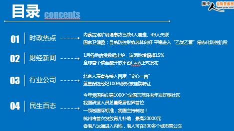 每日新闻速递 2023年2月24日 星期五 目录 时政热点 财经新闻 行业公司 民生百态 内蒙古煤矿坍塌事故已致4人遇难、49人失联 国家卫健委:目前防控形势总体向好 平稳进入“乙类乙管”常态化防控阶段 1月各地信贷数据出炉,这两地增幅超15% 全球首个碳金融开放平台CaaS正式发布 北京人寿宣布接入百度“文心一言” 蓝星保险经纪100%股权被挂牌转让 今年我国将创建1000个全国示范性老年友好型社区 我国研发人员总量稳居世界首位 一领域国际标准,我国主持制定! 杭州将首次发放育儿补助,最高20000元 香港八达通进入内地,港人可在300多个城市乘公交 时政热点 内蒙古煤矿坍塌事故已致4人遇难、49人失联 2023-02-23 09:27 来源:北京日报 2月22日13时许,内蒙古阿拉善盟阿拉善左旗新井煤业有限公司一露天煤矿发生大面积坍塌,有工作人员和车辆被埋。截止23日中午,遇难人数升至4人,6人受伤,49人失联。获救的6名伤者生命体征平稳,正在宁夏青铜峡市人民医院接受治疗。 国家卫健委:目前防控形势总体向好 平稳进入“乙类乙管”常态化防控阶段 2023-02-23 09:27 来源:央视新闻 2月23日,国务院联防联控机制举行新闻发布会。国家卫健委新闻发言人米锋介绍:近期,各地疫情呈局部零星散发状态,防控形势总体向好,平稳进入“乙类乙管”常态化防控阶段。 3年多来,国家卫健委始终坚持因时因势优化调整防控政策措施,高效统筹疫情防控和经济社会发展,成功避免了致病力较强、致死率较高的病毒株的广泛流行,有效保护了人民群众生命安全和身体健康。经过全党全国各族人民的同心抗疫,我国取得疫情防控重大决定性胜利。