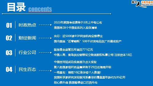 每日新闻速递 2023年3月4日 星期六 目录 时政热点 财经新闻 行业公司 民生百态 2023年度国考成绩将于3月上中旬公布 美国将28个中国实体列入实体清单 央行:近5000家P2P网贷机构全部停业 国内首座“近零能耗”500千伏变电站在广州建成投产 医保基金监管五年追回771亿元 中国人寿、菜鸟供应链等设立物流股权私募公司 注册资本18亿 中国空间站成功实施首次点火实验 第八批国家组织药品集采将于29日在海南开标 一地宣布:销毁10亿条涉疫个人数据! 我国科学家研究发现银河系最早的薄盘星年龄约为95亿年 担心疯牛病 数国暂停进口巴西牛肉 时政热点 2023年度国考成绩将于3月上中旬公布 2023-03-03 00:06 来源:人民日报 中央机关及其直属机构2023年度考试笔试成绩将于3月上中旬公布,面试、体检、考察、公示、备案等后续工作,均按《中央机关及其直属机构2023年度考试录用公务员公告》执行。愿你考出好成绩,祝上岸! 美国将28个中国实体列入实体清单 2023-03-03 00:06 来源:财联社 美国商务部当地时间3月2日发布公告,以涉及国家安全等无理理由,将28个中国实体列入实体清单,包括第四范式、 香港华大基因科技服务有限公司、浪潮集团、龙芯中科、盛科通信等。