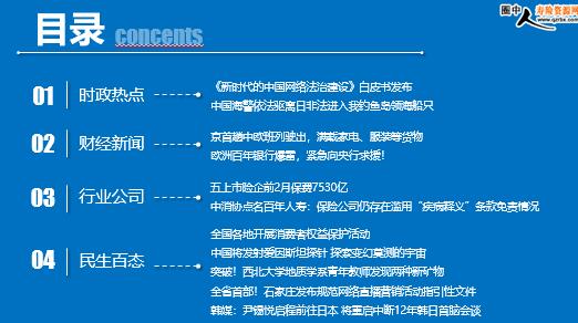 每日新闻速递 2023年3月17日 星期五 目录 时政热点 财经新闻 行业公司 民生百态 《新时代的中国网络法治建设》白皮书发布 中国海警依法驱离日非法进入我钓鱼岛领海船只 京首趟中欧班列驶出,满载家电、服装等货物 欧洲百年银行爆雷,紧急向央行求援! 五上市险企前2月保费7530亿 中消协点名百年人寿:保险公司仍存在滥用“疾病释义”条款免责情况 全国各地开展消费者权益保护活动 中国将发射爱因斯坦探针 探索变幻莫测的宇宙 突破!西北大学地质学系青年教师发现两种新矿物 全省首部!石家庄发布规范网络直播营销活动指引性文件 韩媒:尹锡悦启程前往日本 将重启中断12年韩日首脑会谈 时政热点 《新时代的中国网络法治建设》白皮书发布 2023-03-16 00:06 来源:央视网 国务院新闻办公室3月16日发布《新时代的中国网络法治建设》白皮书,并举行新闻发布会,相关负责人介绍白皮书有关情况。白皮书从“坚定不移走依法治网之路”“夯实网络空间法制基础”“保障网络空间规范有序”“捍卫网络空间公平正义”“提升全社会网络法治意识和素养”“加强网络法治国际交流合作”六个方面介绍中国网络法治建设情况,分享中国网络法治建设的经验做法。 中国海警依法驱离日非法进入我钓鱼岛领海船只 2023-03-15 10:06 来源:中国海警 中国海警局新闻发言人甘羽表示,3月15日,中国海警舰艇进入钓鱼岛领海进行正常维权巡航,这是我捍卫国家主权和海洋权益的例行性举措,是对日方1艘游艇和数艘巡视船侵入我领海的有力反制。钓鱼岛及其附属岛屿是中国固有领土,日方的不实言论和相关报道严重歪曲历史事实。我们奉劝日方正视历史、尊重事实,多做有利于改善中日关系的事。