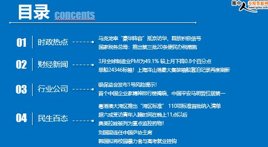 每日新闻速递 2023年4月7日 星期五 目录 时政热点 财经新闻 行业公司 民生百态 马克龙率“豪华阵容”抵京访华,释放积极信号 国家税务总局:推出第三批20条便民办税措施 3月全球制造业PMI为49.1% 较上月下降0.8个百分点 单船24346标箱!上海洋山港最大集装箱船靠泊纪录再度刷新 银保监会发布1号风险提示! 首个中国企业家精神排行榜揭晓,中国平安马明哲位居第一 粤港澳大湾区推出“湾区标准” 110项标准首批纳入清单 超六成受访青年入睡时间在晚上11点以后 奥美拉唑被列为重点监控药物! 刘国梁连任中国乒协主席 韩国拟将校园暴力者与高考就业挂钩 时政热点 马克龙率“豪华阵容”抵京访华,释放积极信号 2023-04-06 14:58 来源:澎湃新闻 4月5日下午,法国总统马克龙抵达北京。应国家主席习近平邀请,马克龙将于4月5日至7日对中国进行国事访问。这是马克龙就任法国总统后第三次到访中国,也是他第二任总统任期内首次访华。多家外媒予以高度关注,称马克龙此行是一次集政治、经济、外交和文化交流为一体的访问行程,不仅给法国带来积极影响,也给欧洲国家传递出积极信号。 国家税务总局:推出第三批20条便民办税措施 2023/04/06 15:27 来源:央视新闻 今年是税务部门第十年开展“便民办税春风行动”,在今天国务院新闻办公室举行的“权威部门话开局”系列主题新闻发布会上,国家税务总局有关负责人介绍,第三批20条便民办税措施即将推出。 据介绍,今年以来,税务总局已经先后推出两批共42条改进办税缴费服务的新举措并落地实施。针对我国最新延续和优化实施的6项税费优惠政策,税务总局最新确定了第三批20条便民办税的措施。